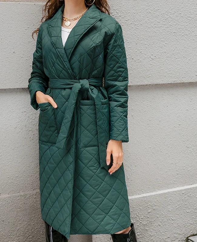 El modelo Bali es un abrigo largo acolchado. Diseño verde con cinturón y bolsillos