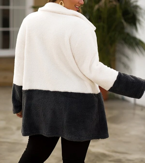El modelo Beary es un abrigo abierto de pelo sintético para talla grande, diseño en blanco y negro con bolsillos