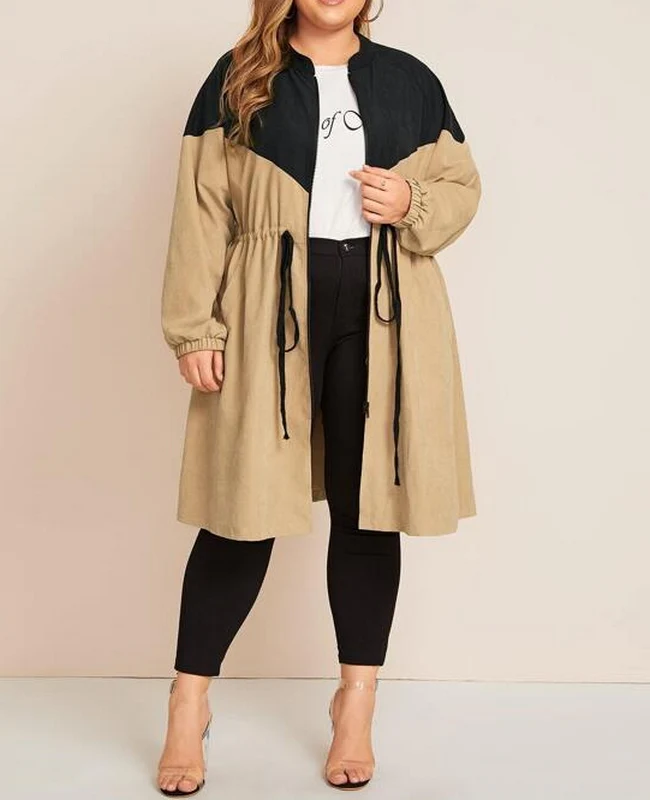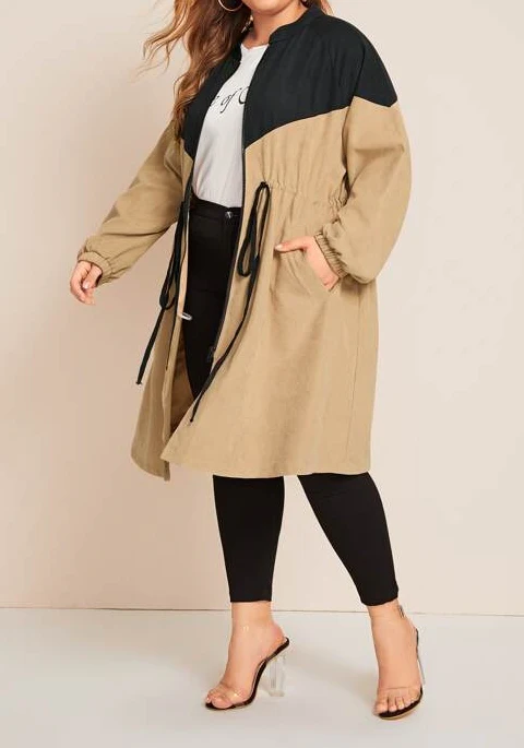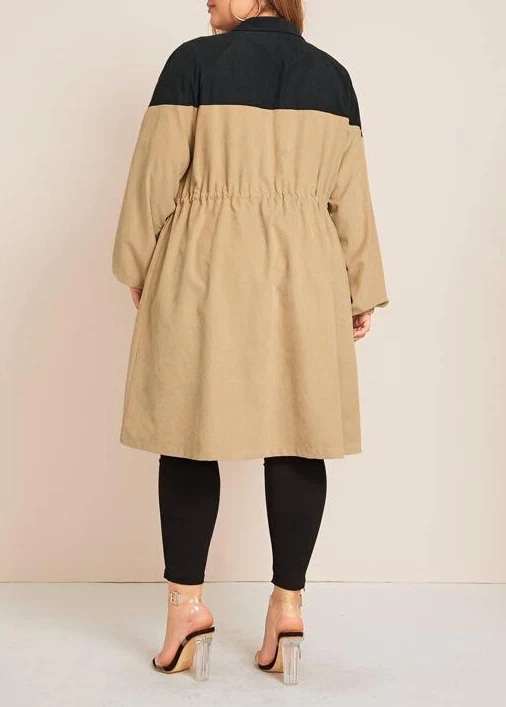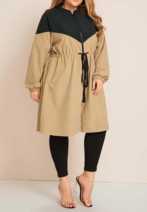 El modelo Beiga es un abrigo largo estilo gabardina para talla grande, su diseño beige y negro, con cuerda como cinturón y cremallera