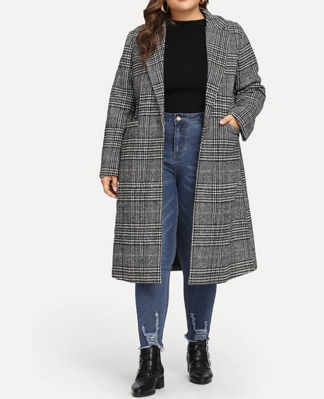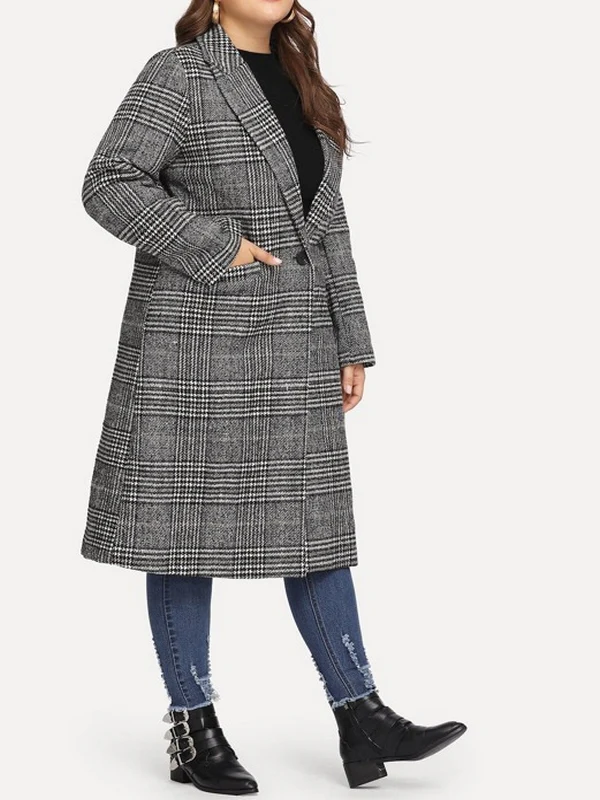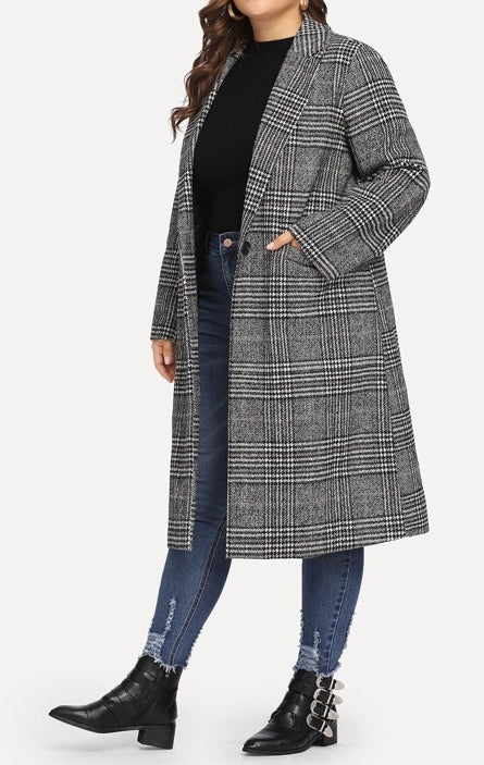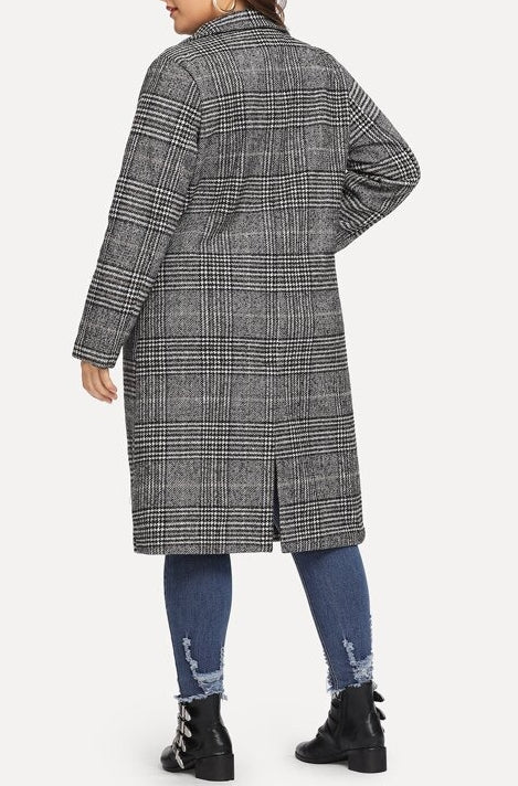 El modelo Cuarter es un abrigo para talla grande de estilo clásico. Su diseño gris con estampado de cuadros, bolsillos y botones
