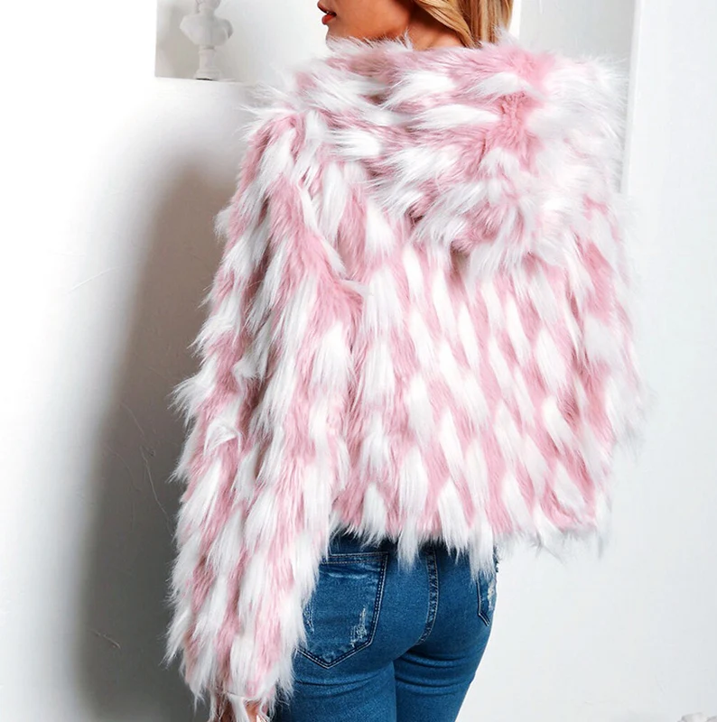 El modelo Fleur es un abrigo rosa y blanco de pluma suave con capucha.