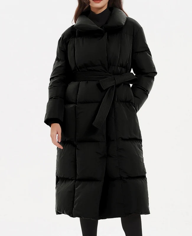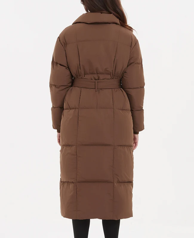 El modelo Giulia es un abrigo acolchado largo. Diseño de plumas con cinturón, disponible en dos colores.