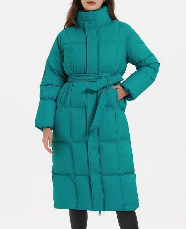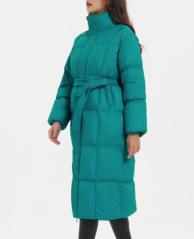 El modelo Hanna es un abrigo acolchado largo. Diseño de plumas con cinturón en color turquesa.