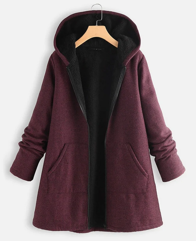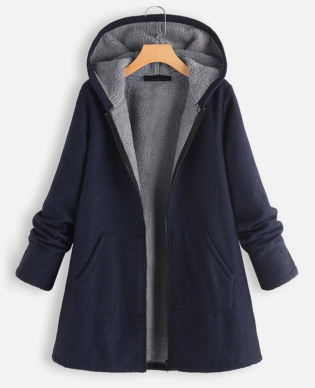 El modelo Nera es un abrigo con capucha y bolsillos. Diseño con cremallera y forro polar interior. Disponible en granate y azul marino.