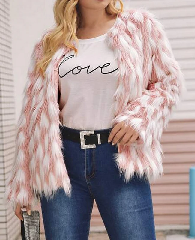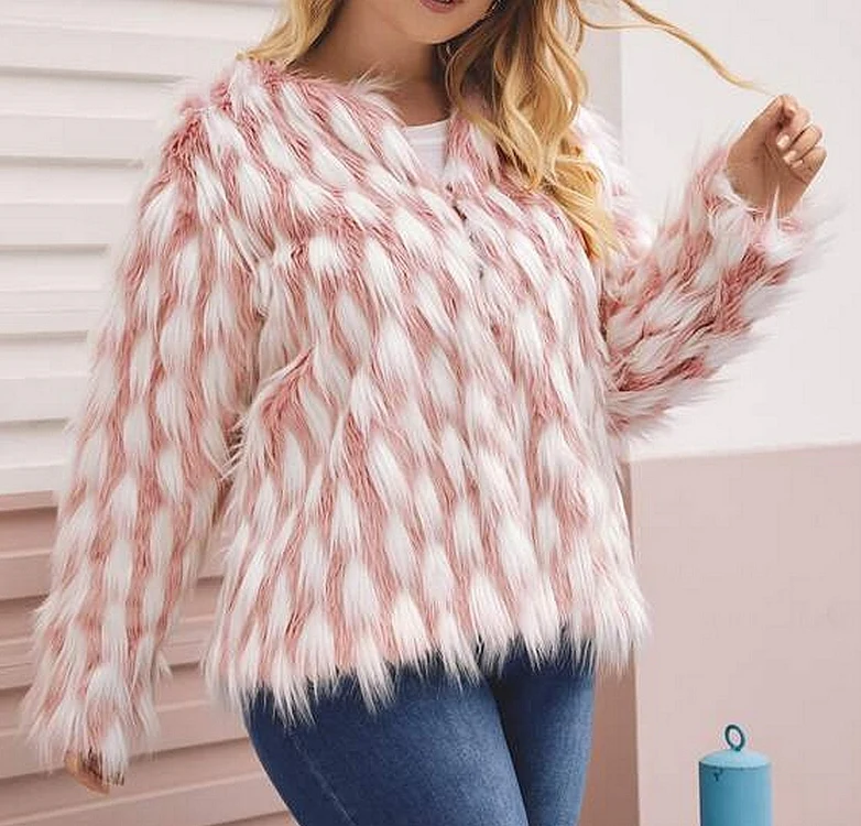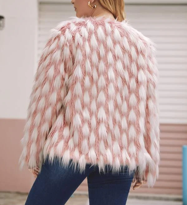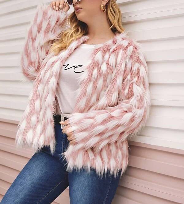 El modelo Spora es un abrigo para talla grande. Diseño suave de pelo sintético en rosa y blanco