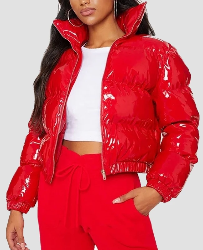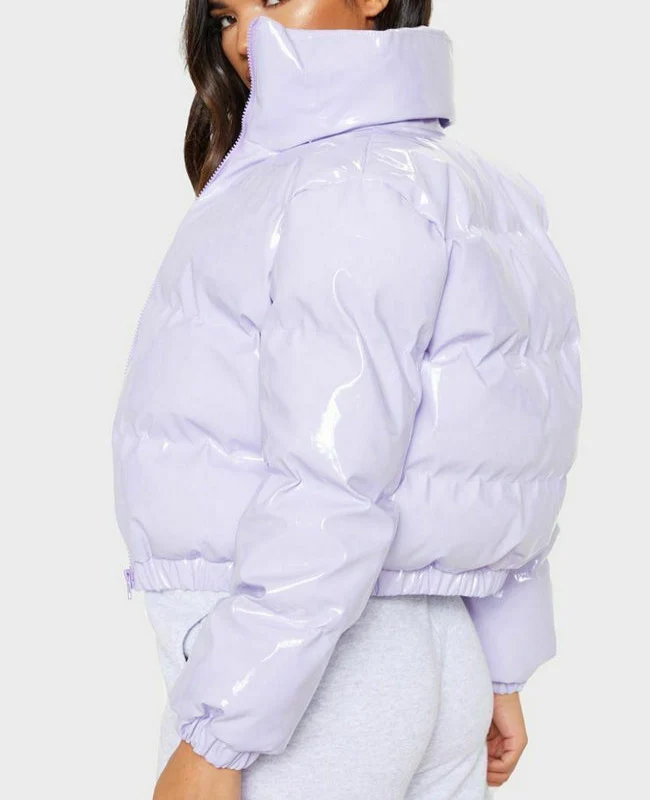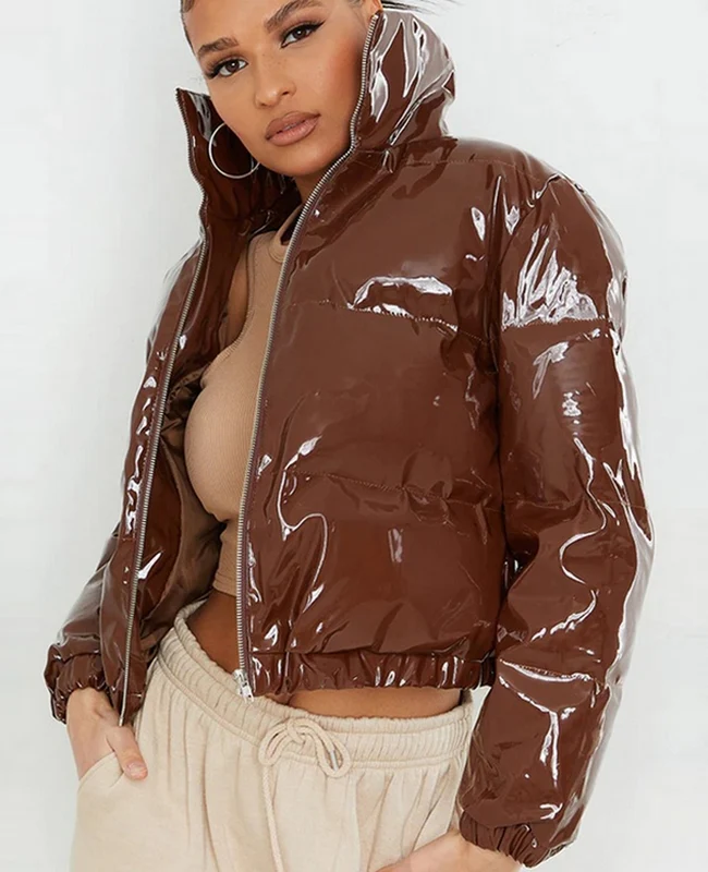 El modelo Stina es un abrigo corto de plumas. Diseño en charol con cremallera disponible en cuatro colores