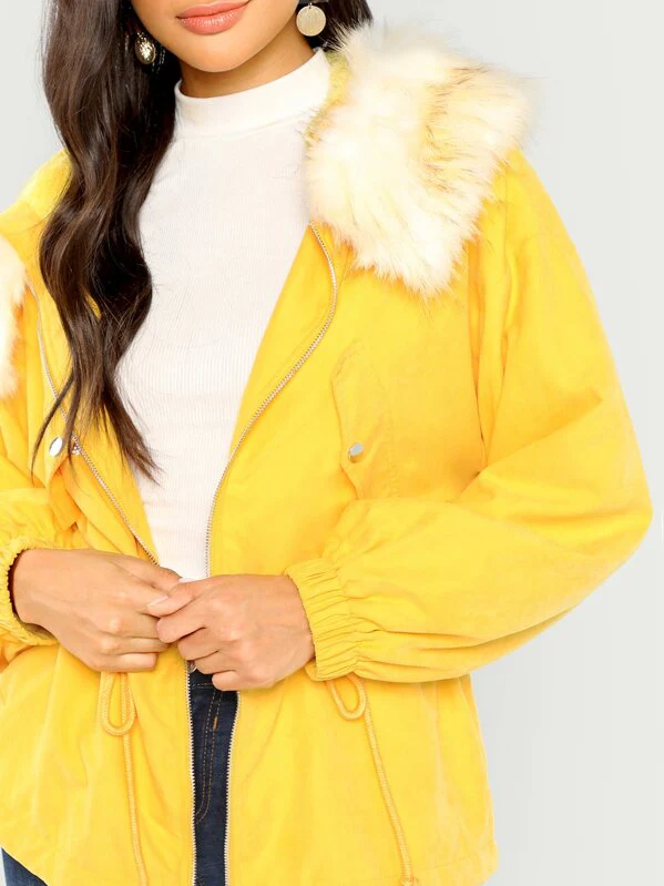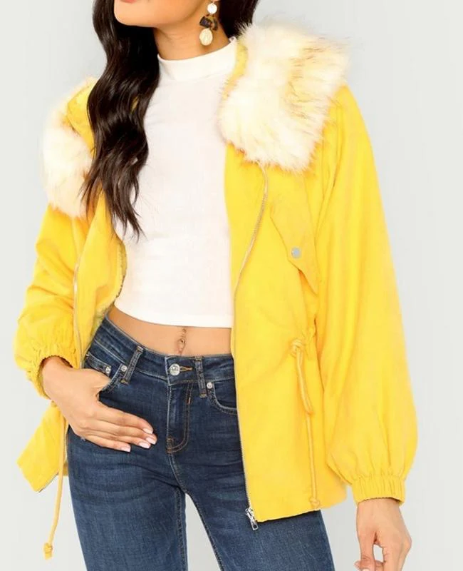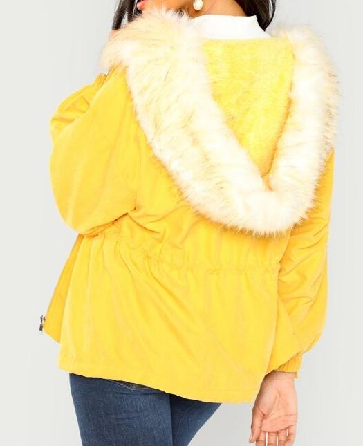 El modelo Valeria es un abrigo amarillo de estilo gabardina corta con capucha de pelo y cuerda de cinturón