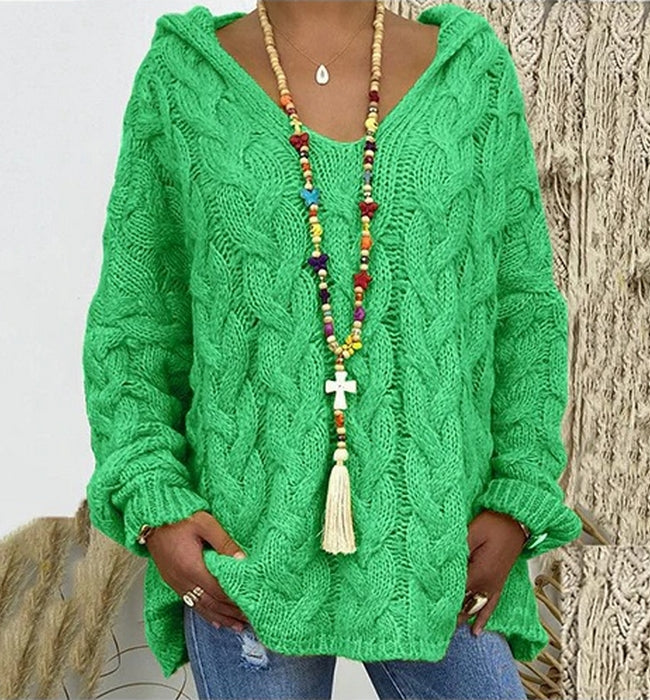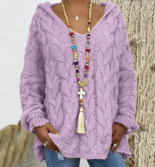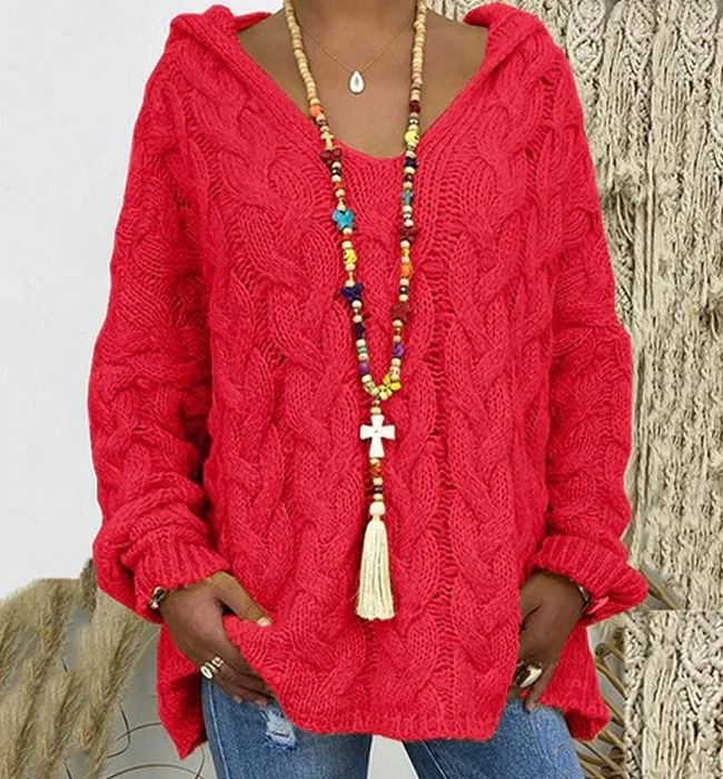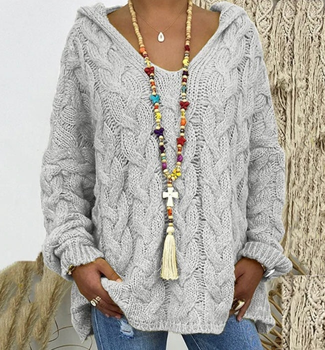 El modelo Sara es un jersey de punto con estampado trenzado. Diseño de estilo ancho con capucha y manga elástica