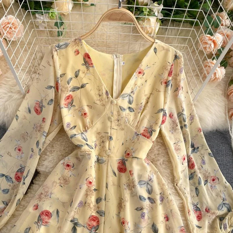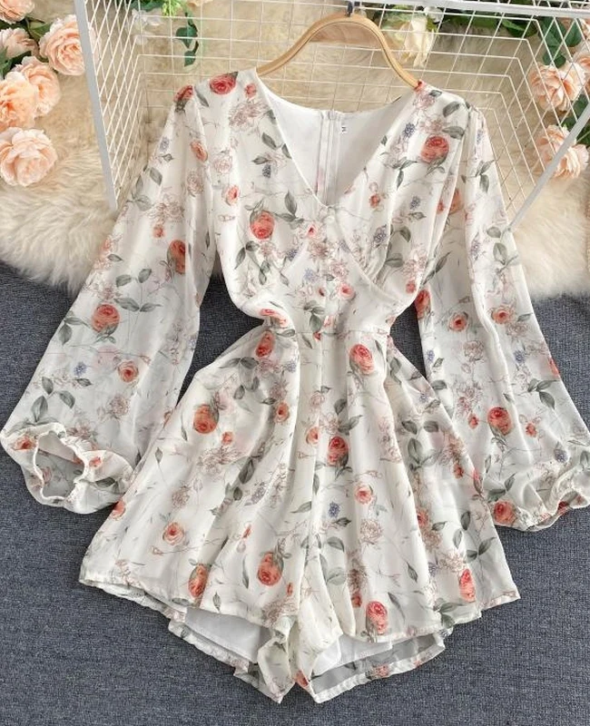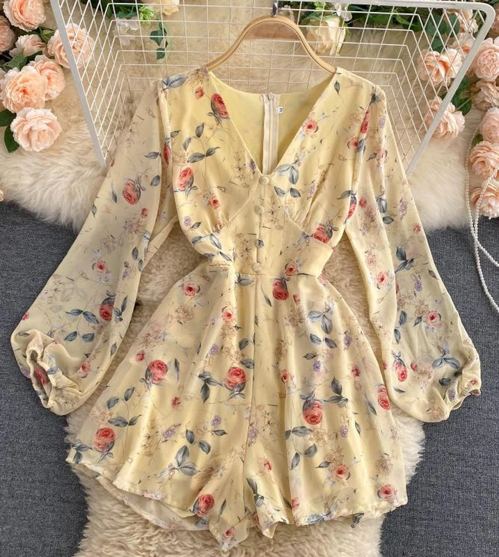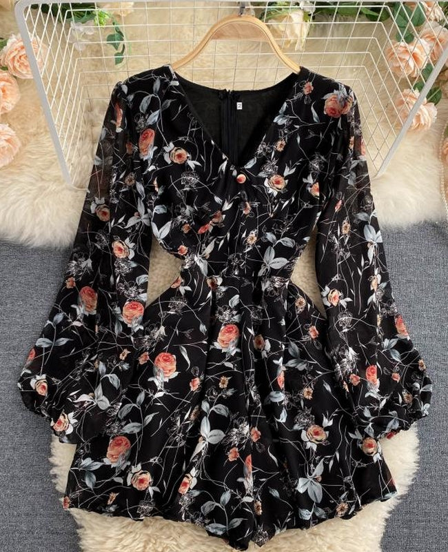 El modelo Azor es un mono corto de manga larga. Diseño estampado floral con botones delanteros y cremallera trasera