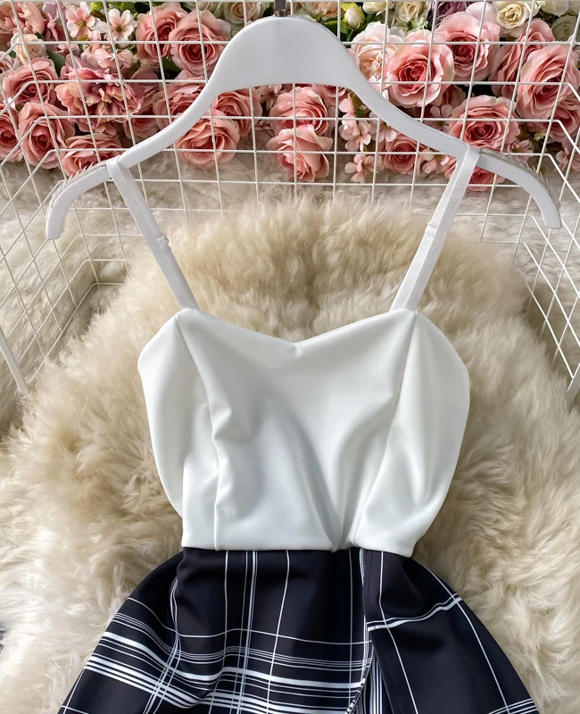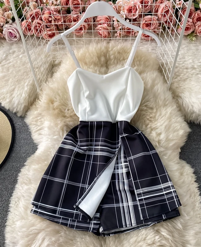 El modelo Deia es un mono corto de tirantes ajustables. Diseño estampado de cuadros con parte inferior de estilo skort y cremallera trasera