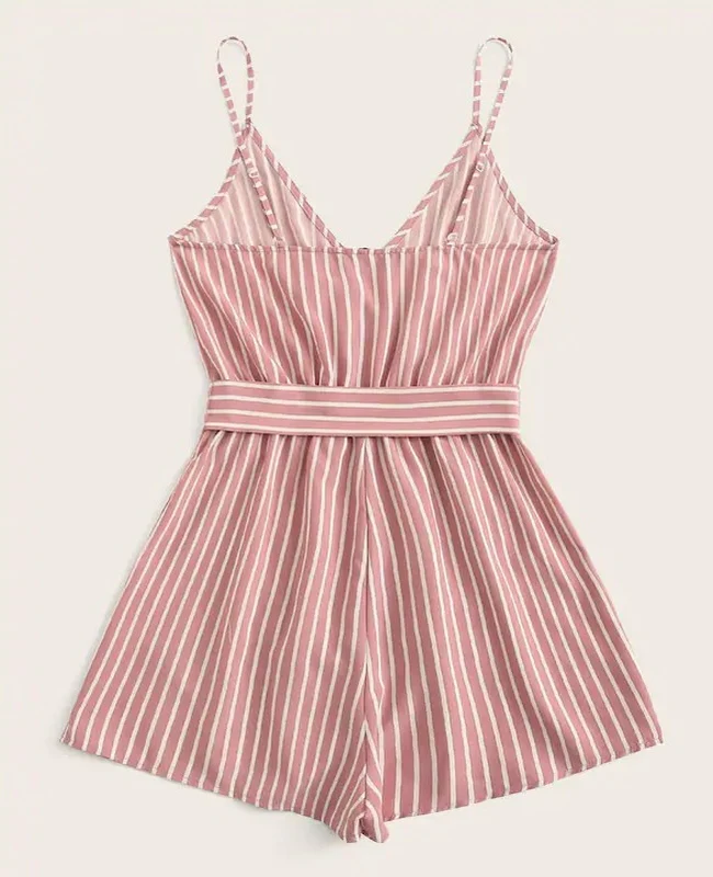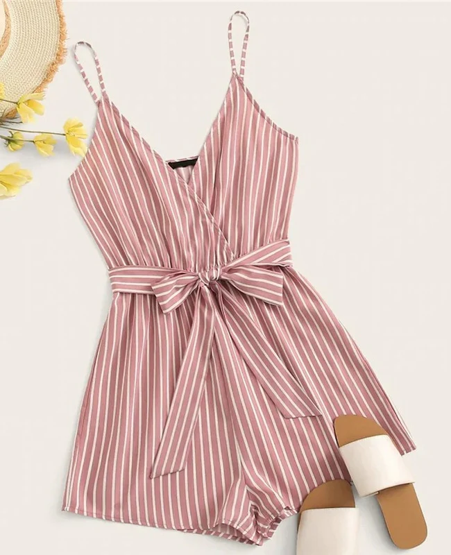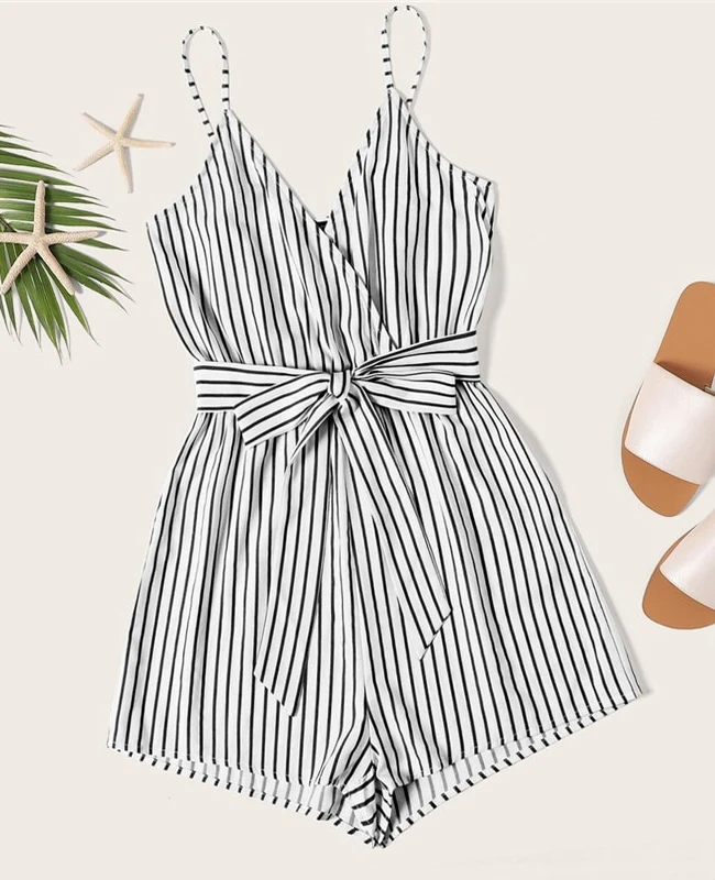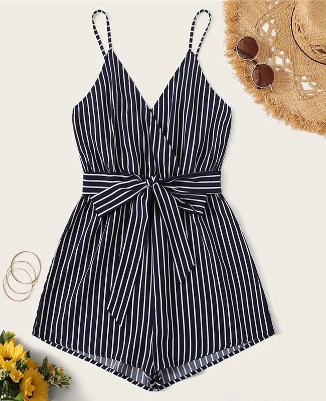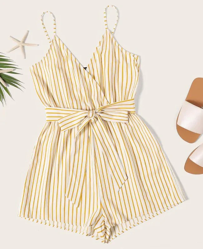 El modelo Ezza es un mono corto de tirantes finos. Diseño con estampado de rayas, escote cruzado y lazo en la cintura