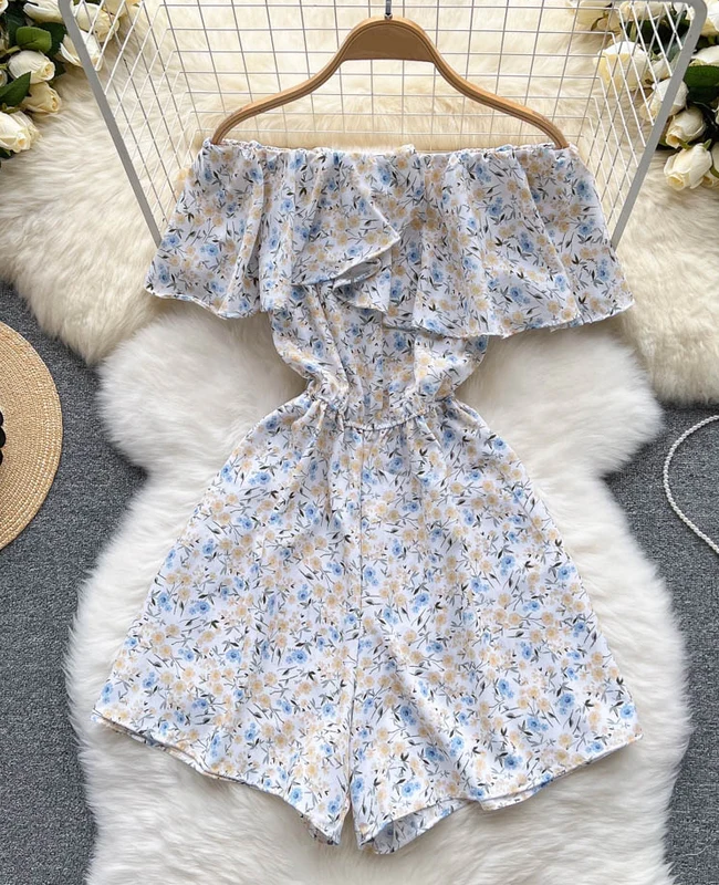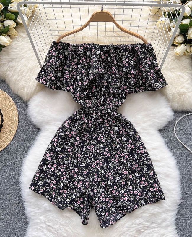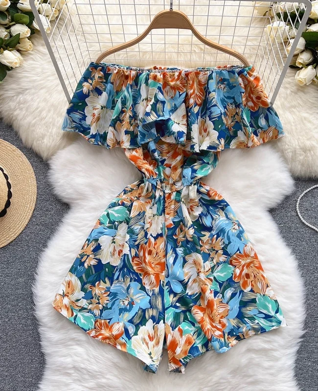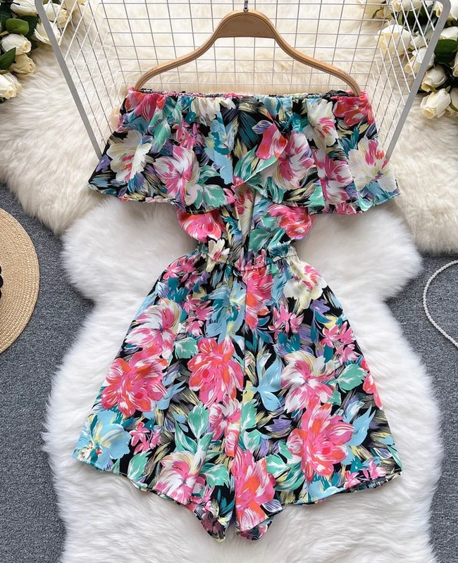 El modelo Leyte es un mono corto de manga corta. Diseño estampado floral con volantes y cintura elástica