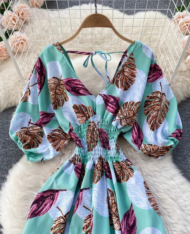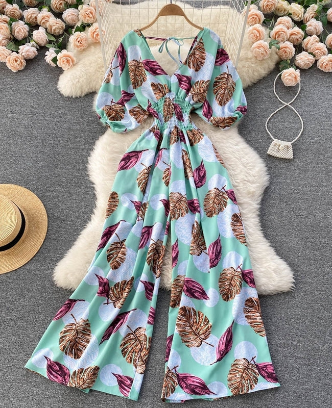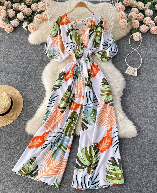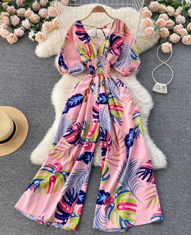 El modelo Adriana es un mono largo de manga corta. Diseño estampado de estilo ancho con elástico en cintura