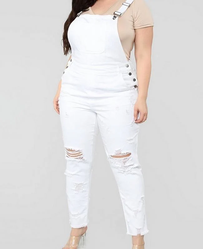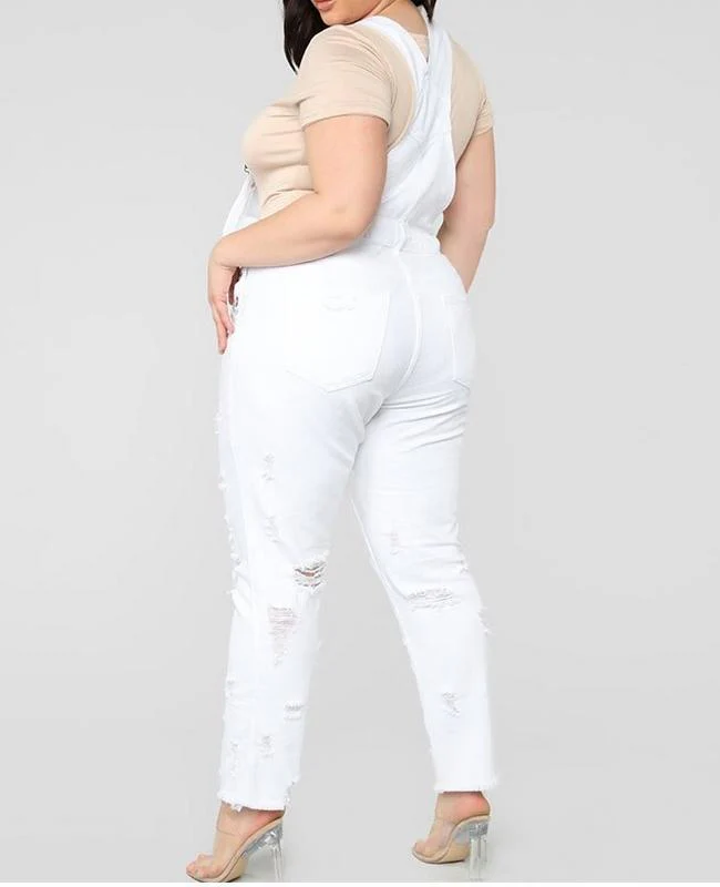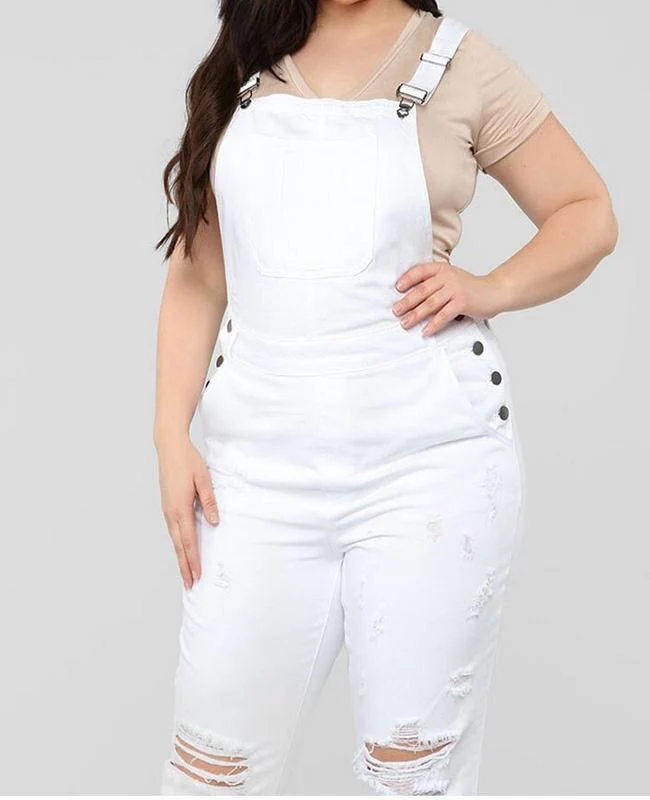 El modelo Anya es un peto vaquero para tallas grandes. Diseño blanco con desgastado y botones laterales