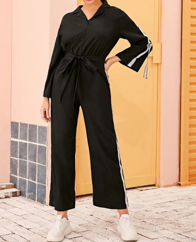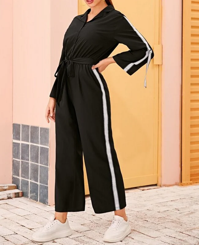 El modelo Coliss es un mono negro de manga larga con lineas laterales blancas y correas en las mangas, diseño con botones y lazo en la cintura