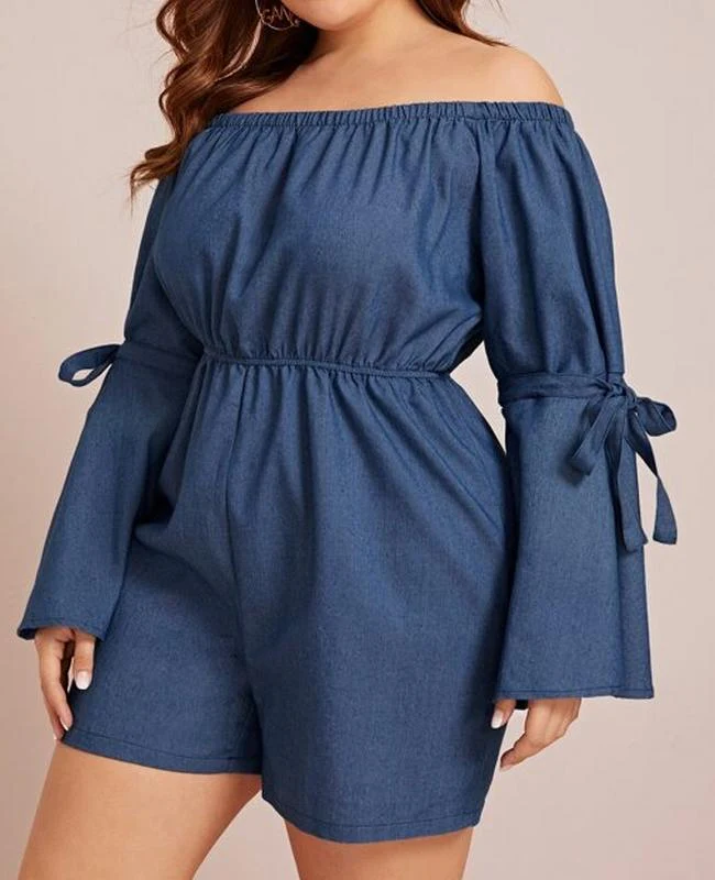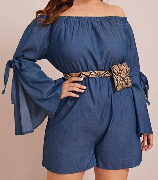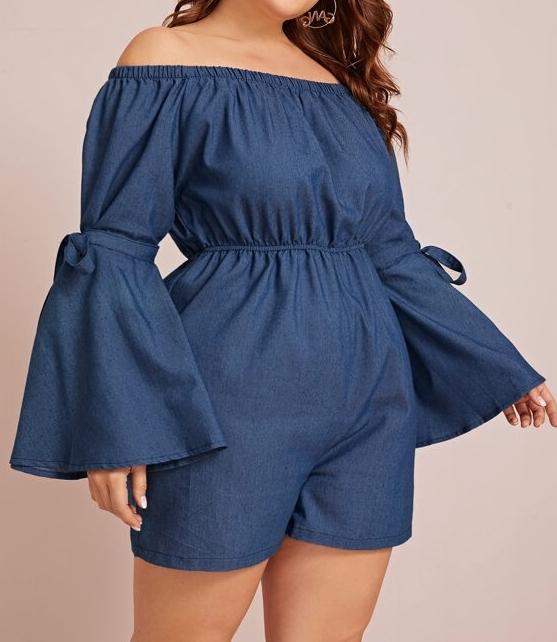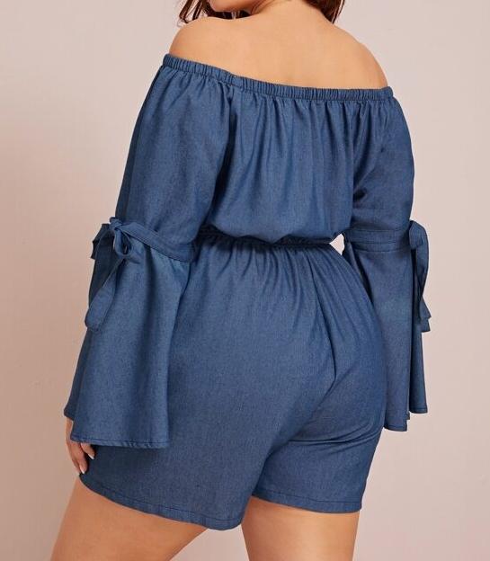 El modelo Damda es un mono vaquero para tallas grandes. Diseño corto con manga larga acampanada y goma en la cintura