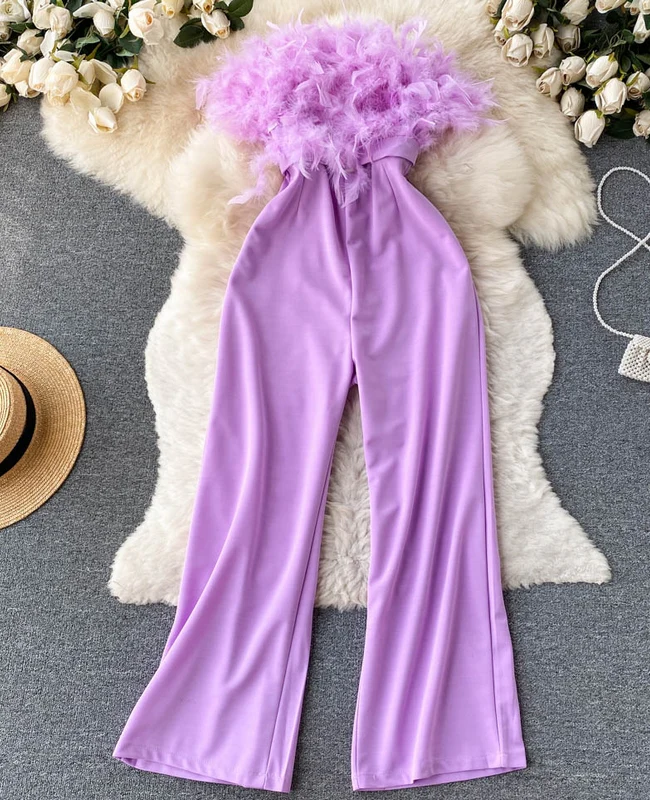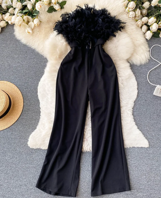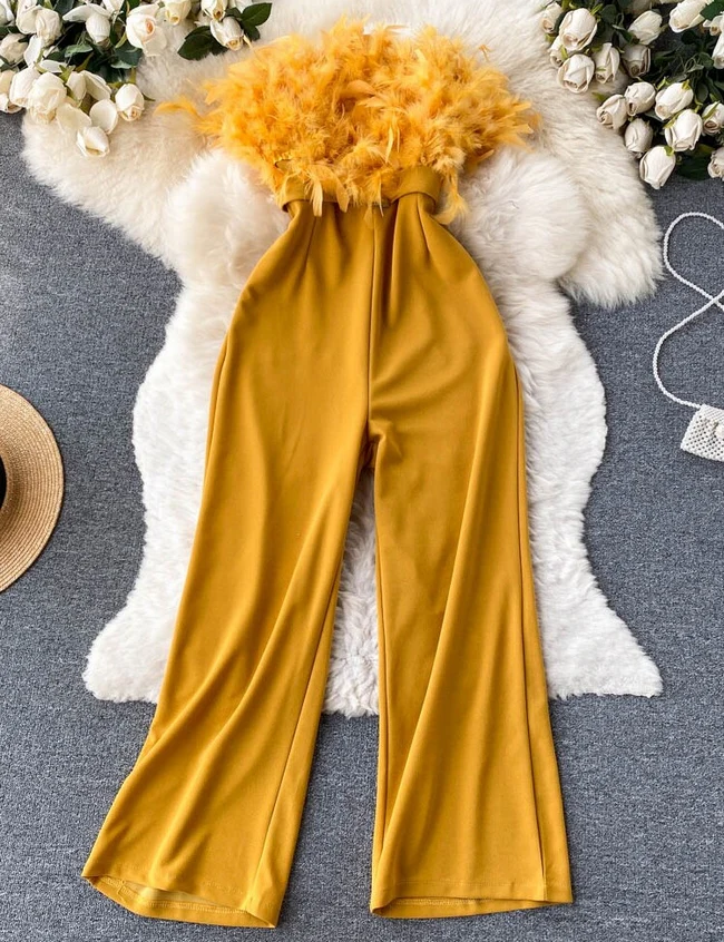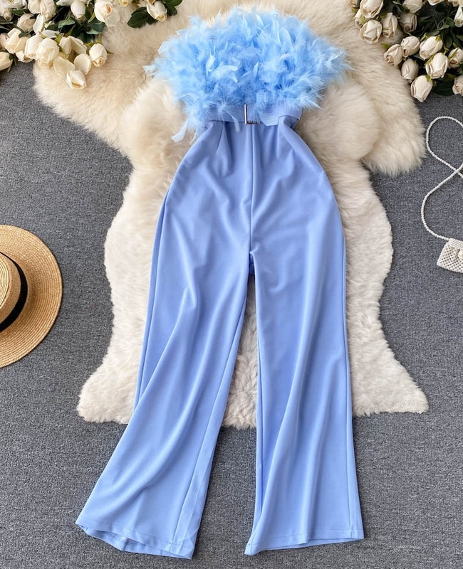 El modelo Eden es un mono largo con plumaje en escote. Diseño con pantalón ancho, cremallera trasera y cinturón plateado