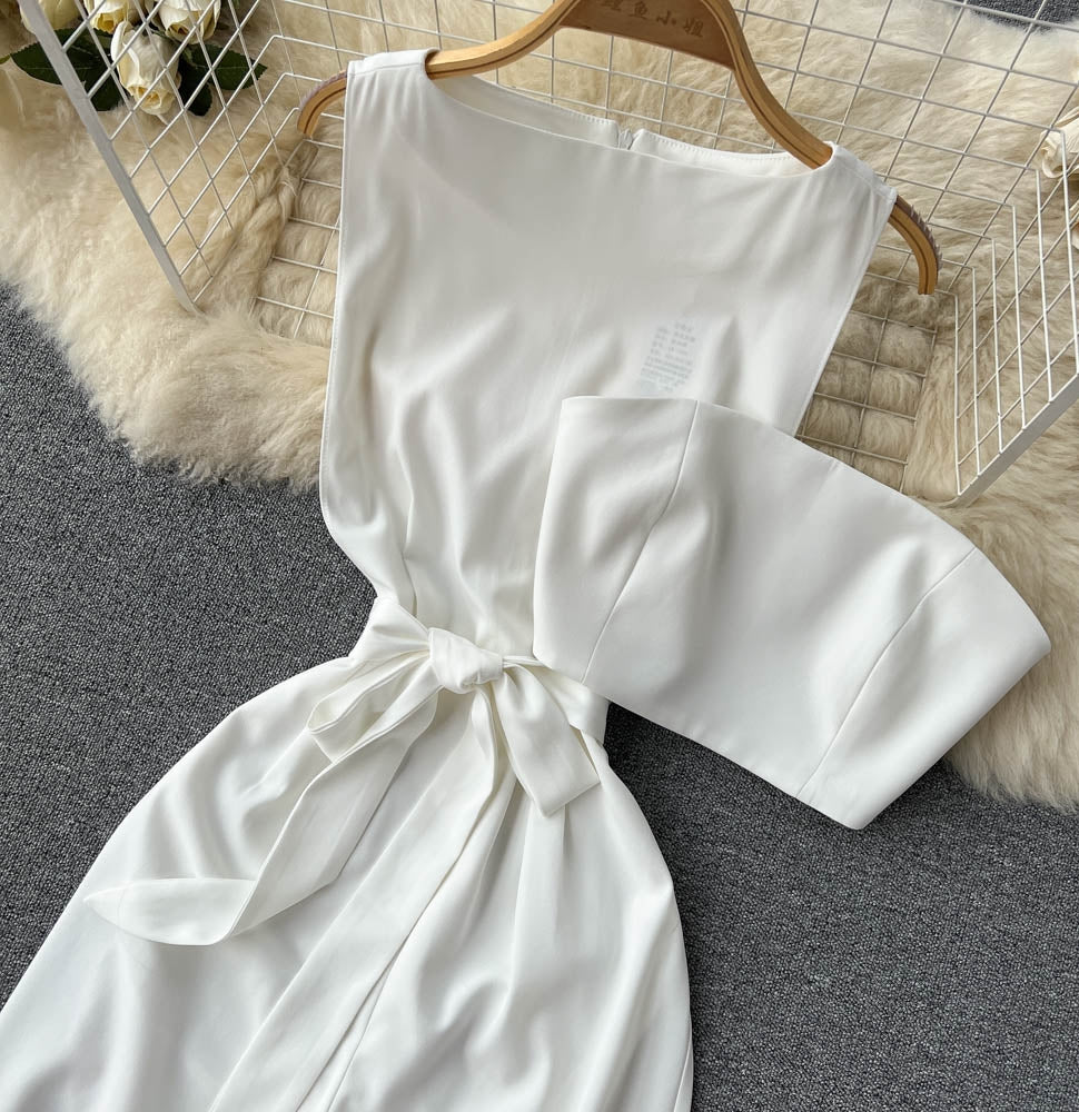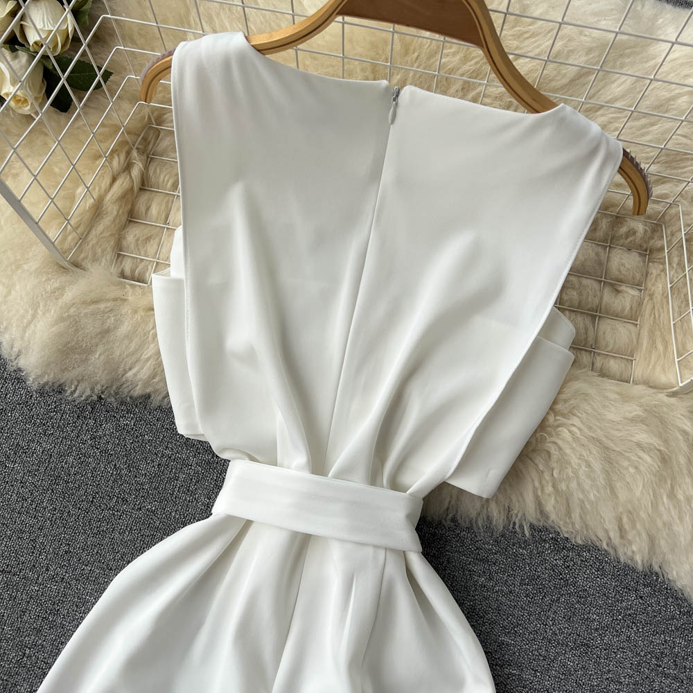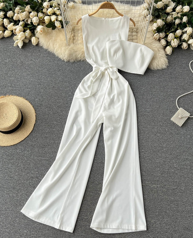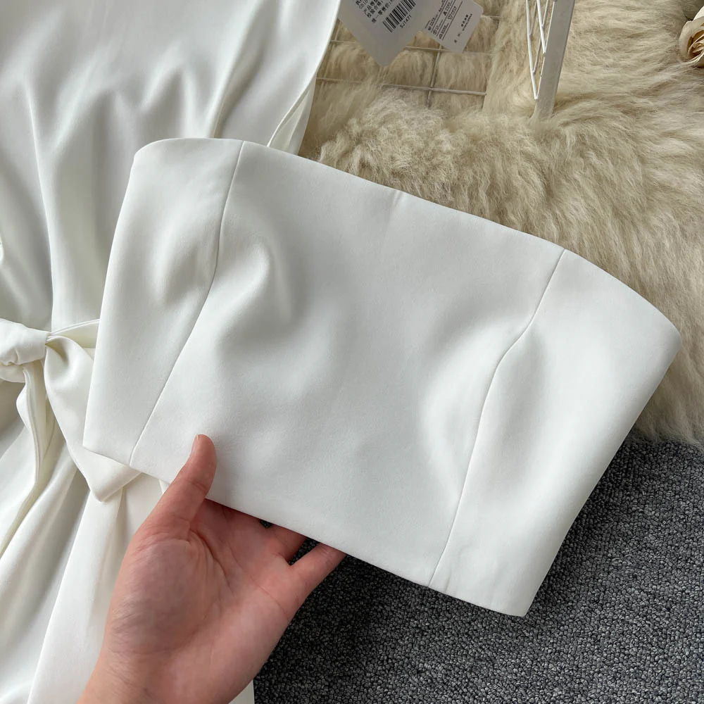 El modelo Emme es un mono blanco largo. Diseño con lazo en cintura y top con cremallera trasera