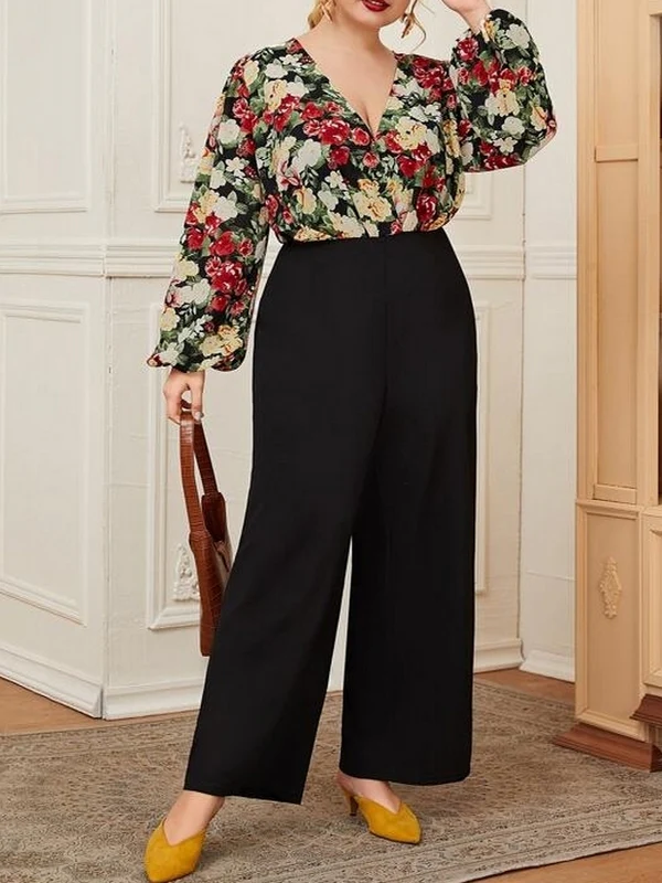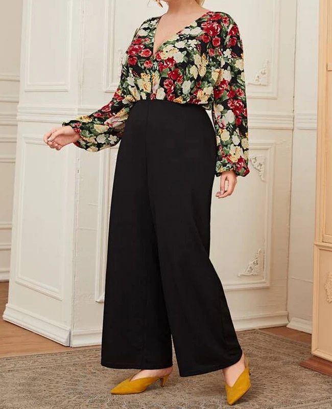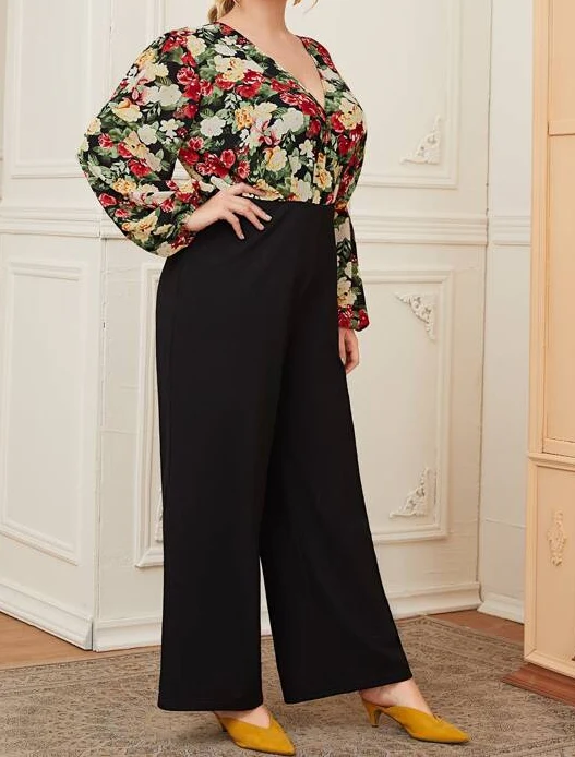 El modelo Ensa es un mono largo para tallas grandes. Diseño con escote cruzado y estampado floral