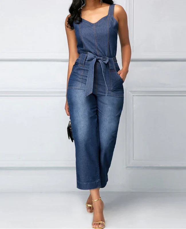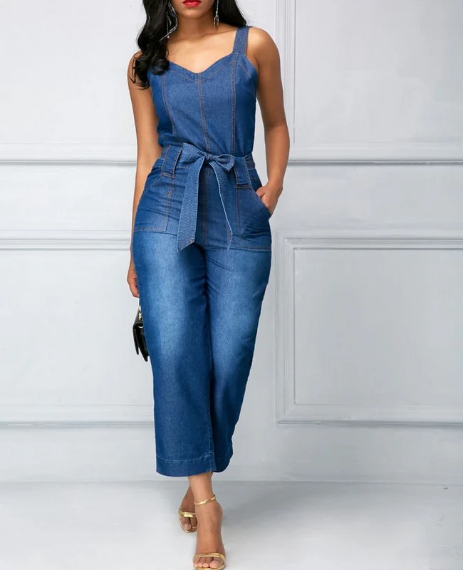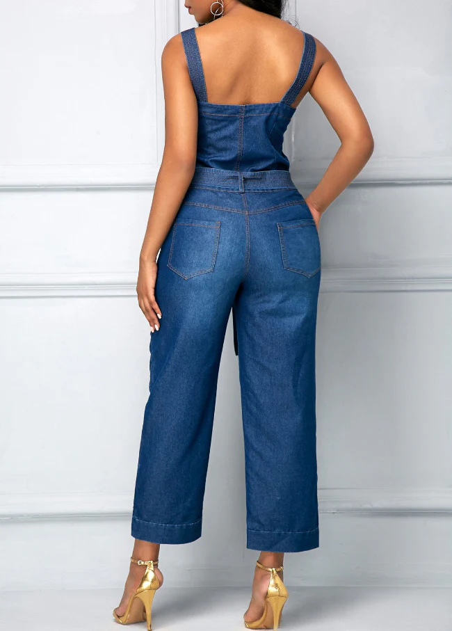 El modelo Liza es un peto vaquero de tirante ancho con bolsillos y cinturón de lazo para ajustar