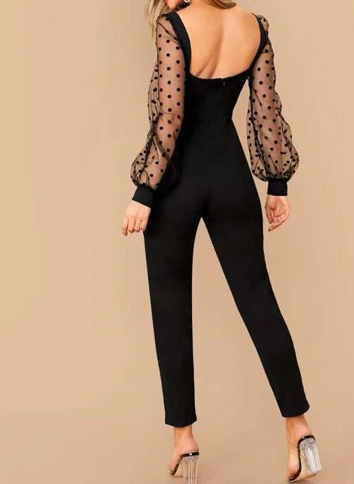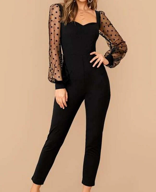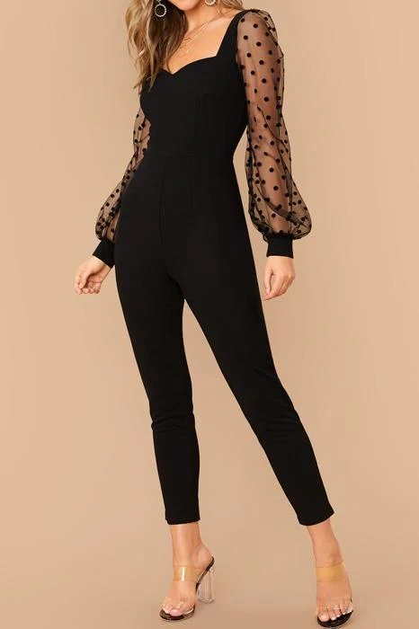 El modelo Marel es un mono negro de manga larga con escote en forma de corazón y manga de encaje estampado
