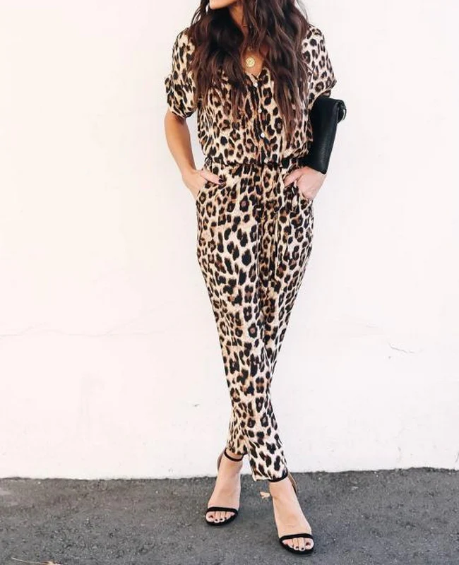 El modelo Orazia es un mono largo de manga corta. Diseño estampado de leopardo con botones y lazo en la cintura