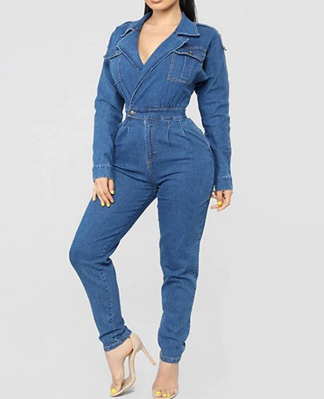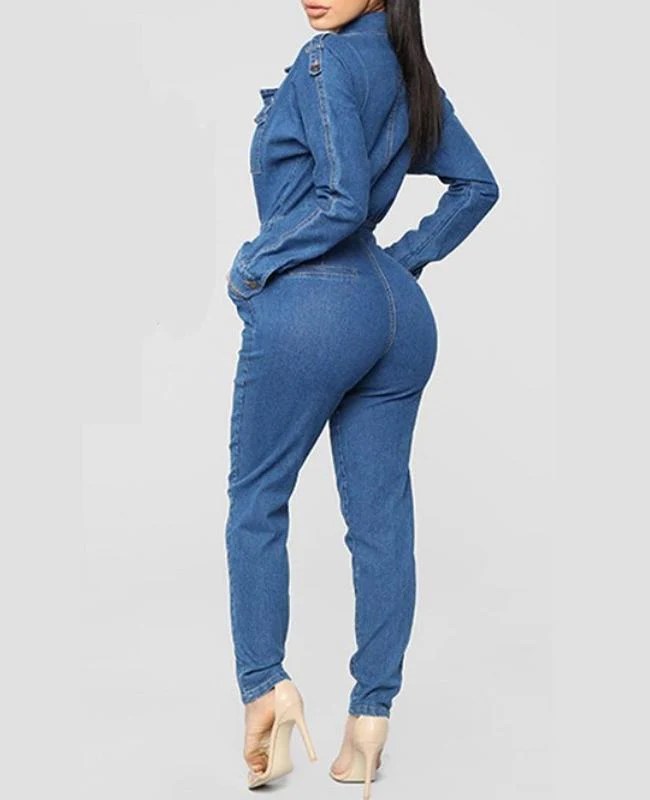 El modelo Reim es un peto vaquero de manga larga. Diseño con escote cruzado y botón en la cintura