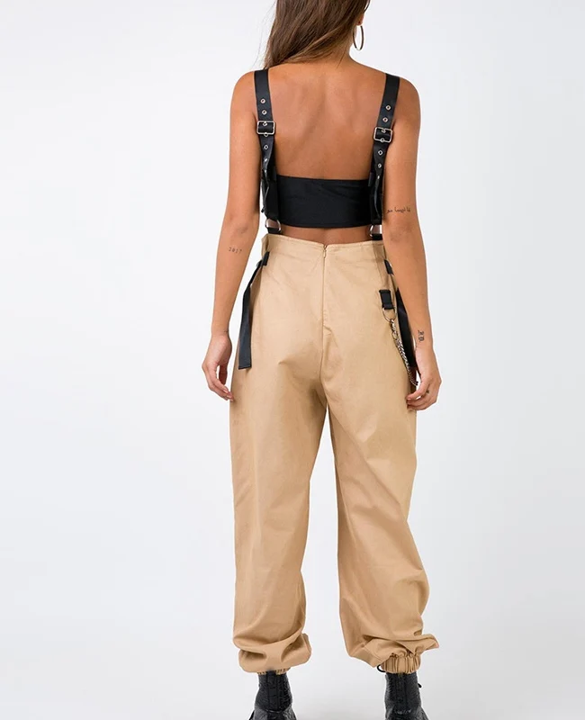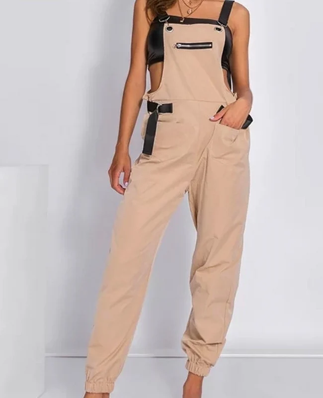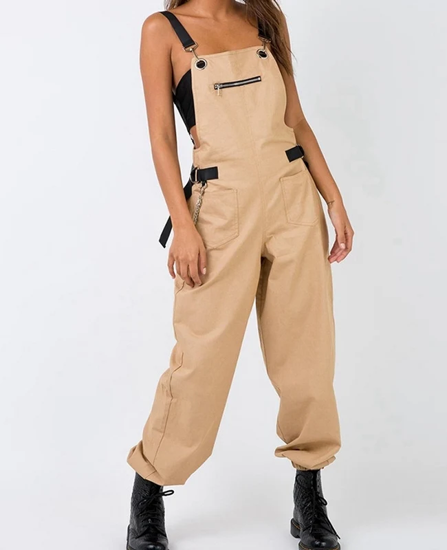 El modelo Tampa es un peto largo en color camel. Diseño con correas negras, bolsillos y cremallera