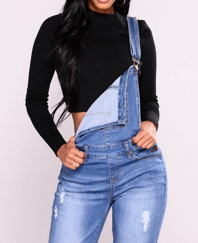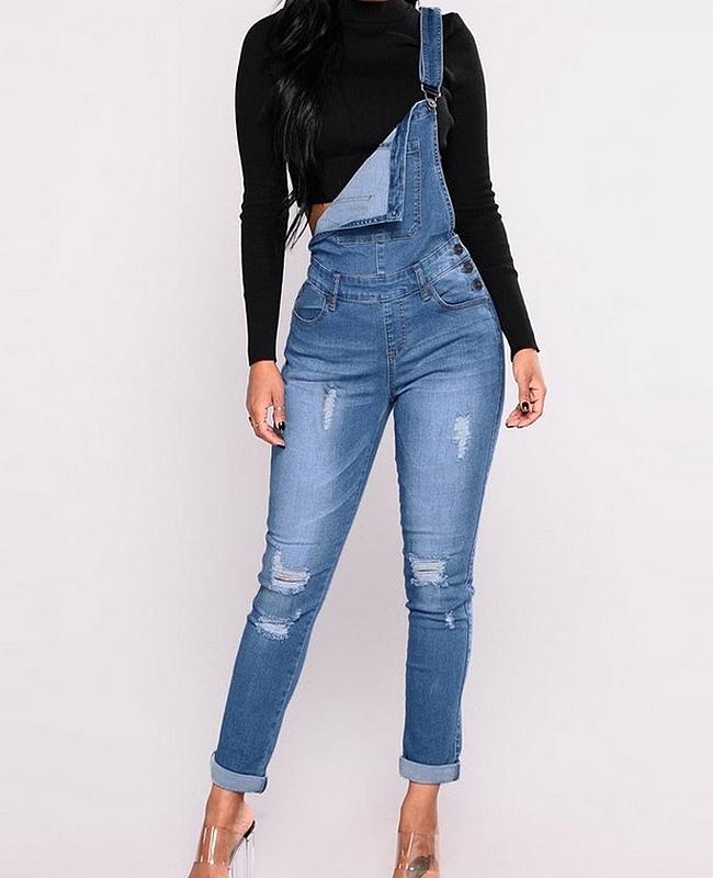 El modelo Verona es un peto vaquero y elástico. Diseño desgastado con bolsillos y botones laterales