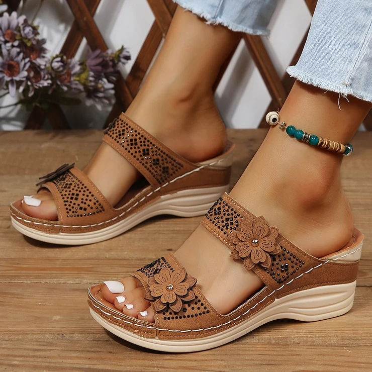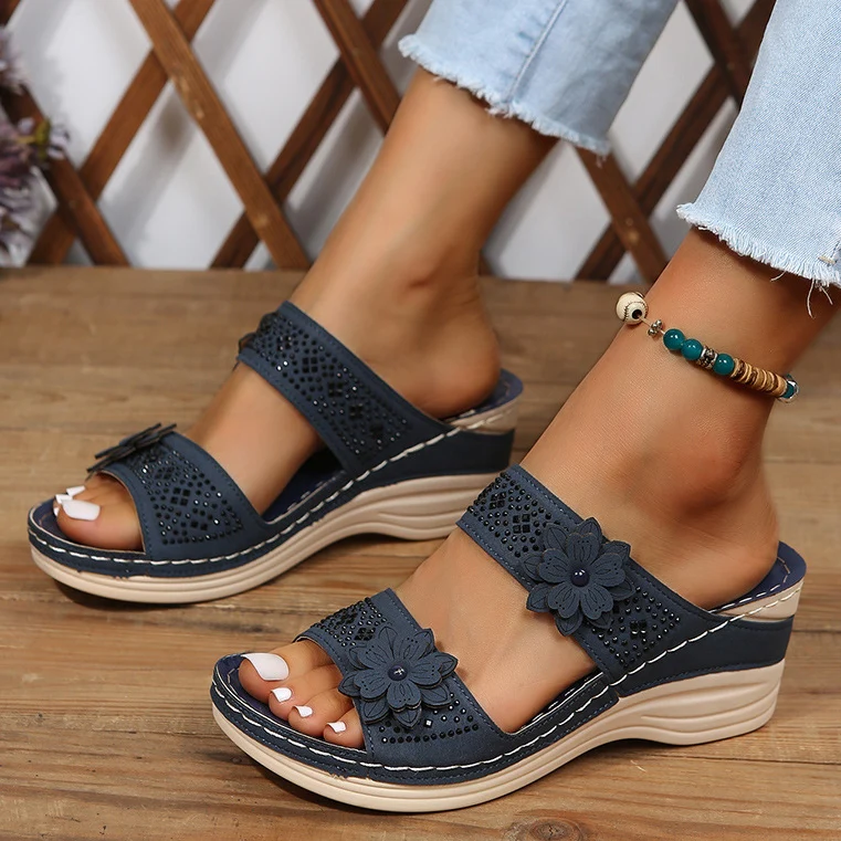 ¡Te sentirás espectacular con nuestras sandalias con plataforma! Estas sandalias presentan un doble agarre para asegurar tu comodidad y una bonita decoración floral para darle un toque de estilo a tu look veraniego. Su plataforma mide seis centímetros.