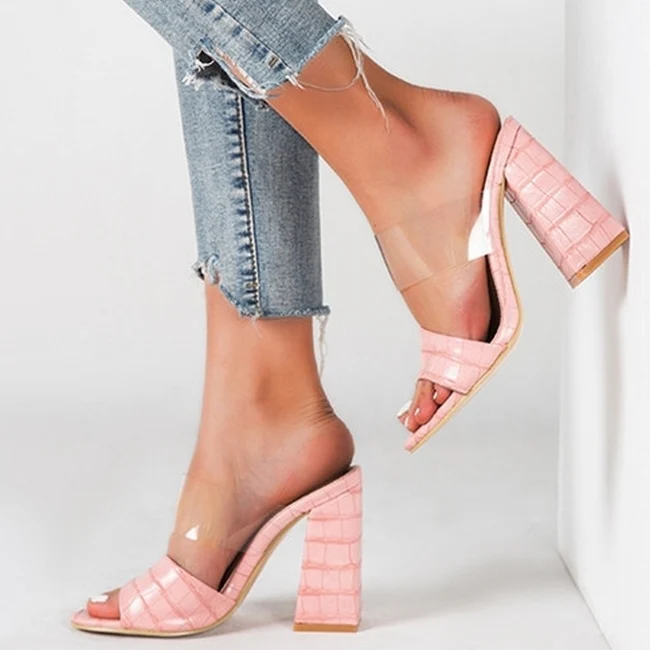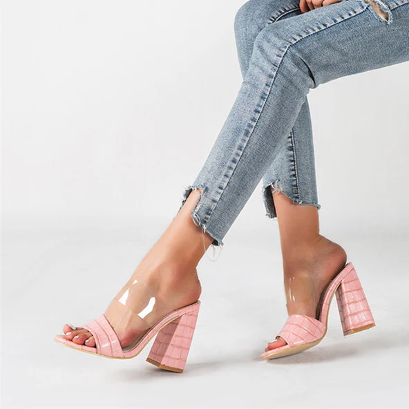 El modelo Amelia es una sandalia alta con banda transparente y suela de goma. Diseño estampado con tacón de 11 centímetros
