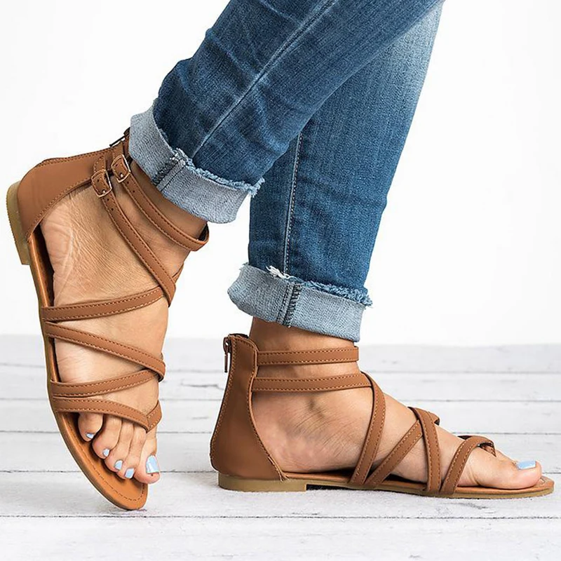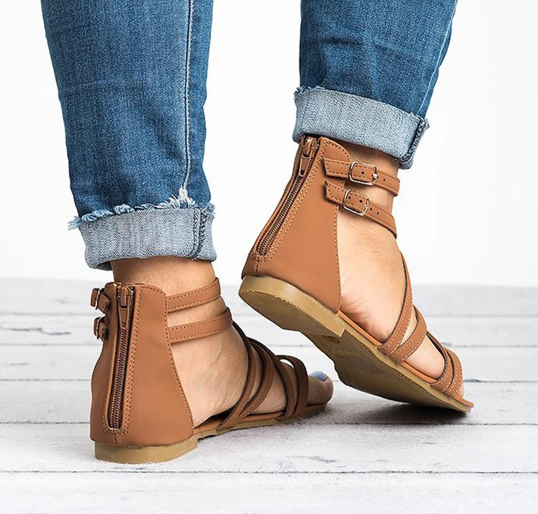 El modelo Ciana es una sandalia plana y abierta con tiras de polipiel y cierre de hebilla doble.