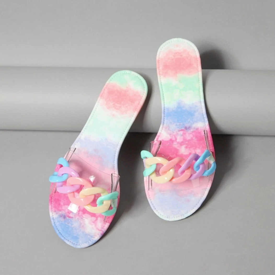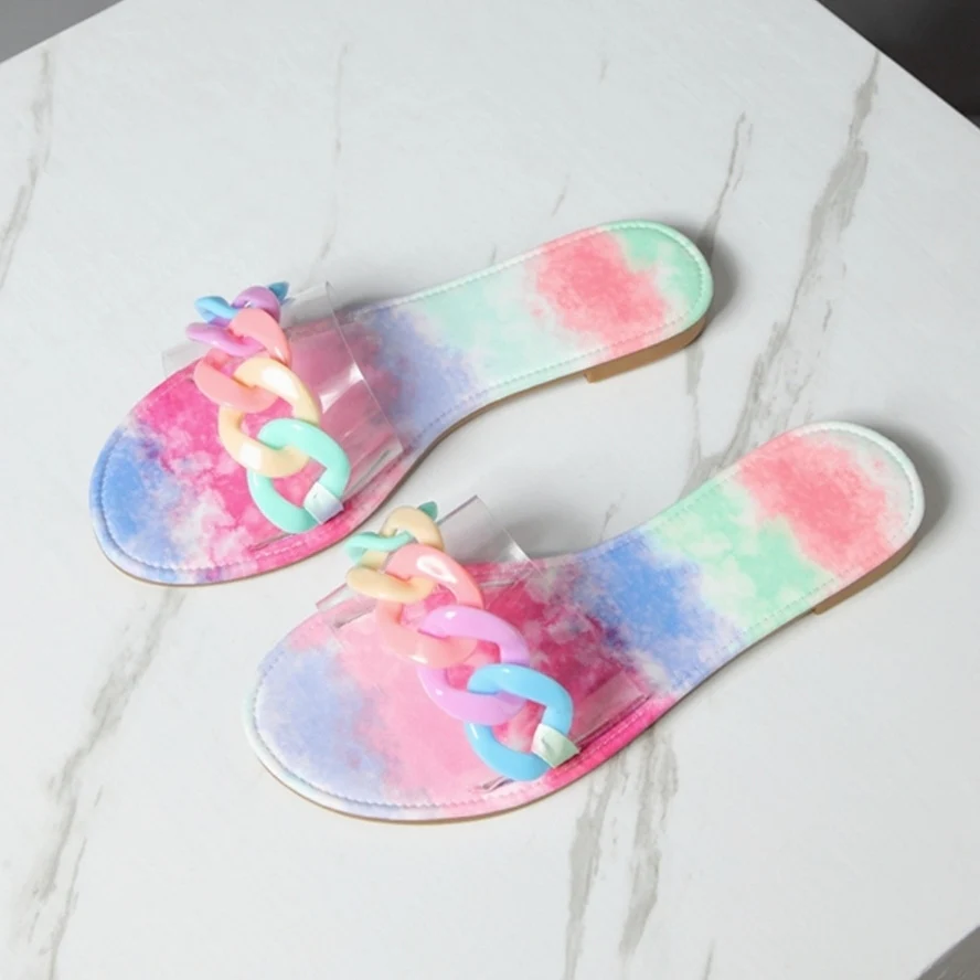 El modelo Dafne es una sandalia plana con un centímetro de tacón. Diseño con suela de goma y banda con decoración de cadena