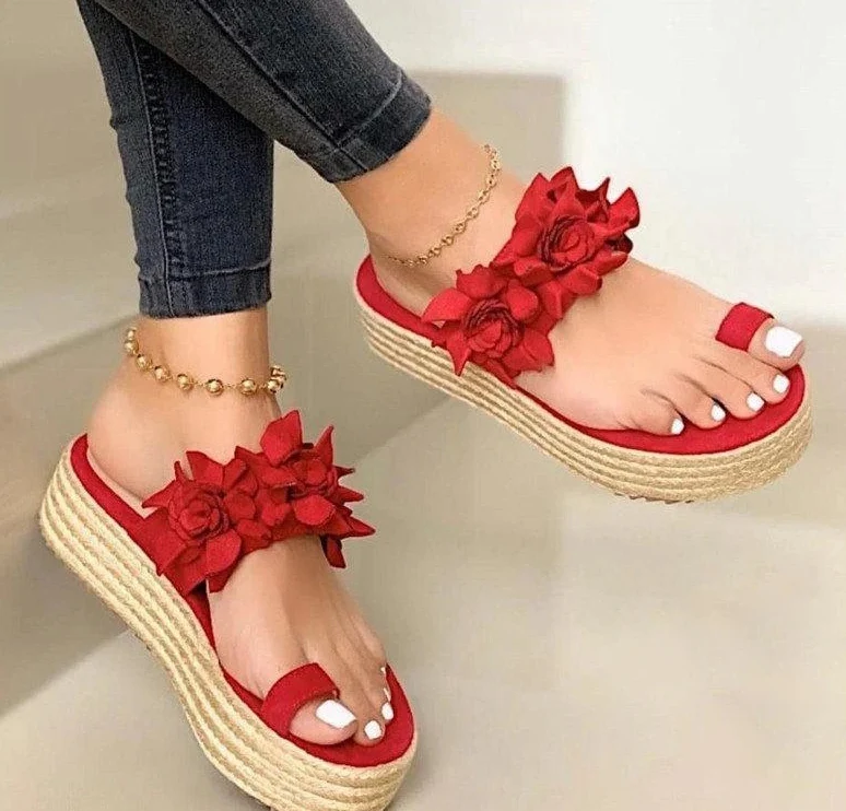 El modelo Erene es una sandalia con plataforma de esparto y decoración floral. Está disponible en tres colores