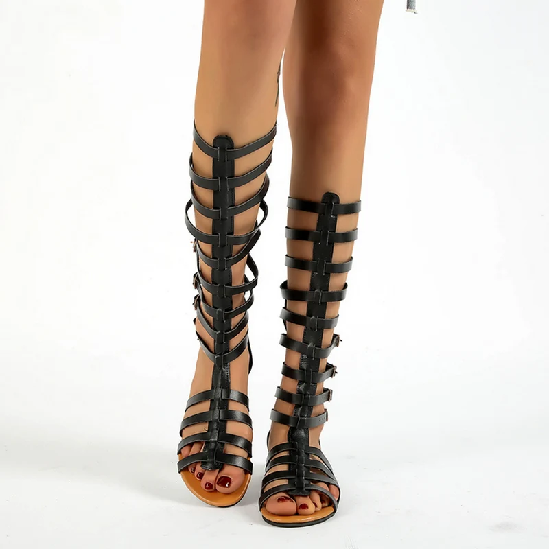 El modelo Galia es una sandalia plana con tiras altas ajustables con hebillas y cremallera trasera.