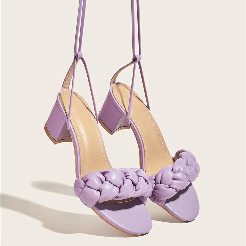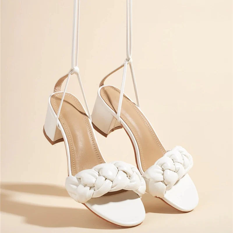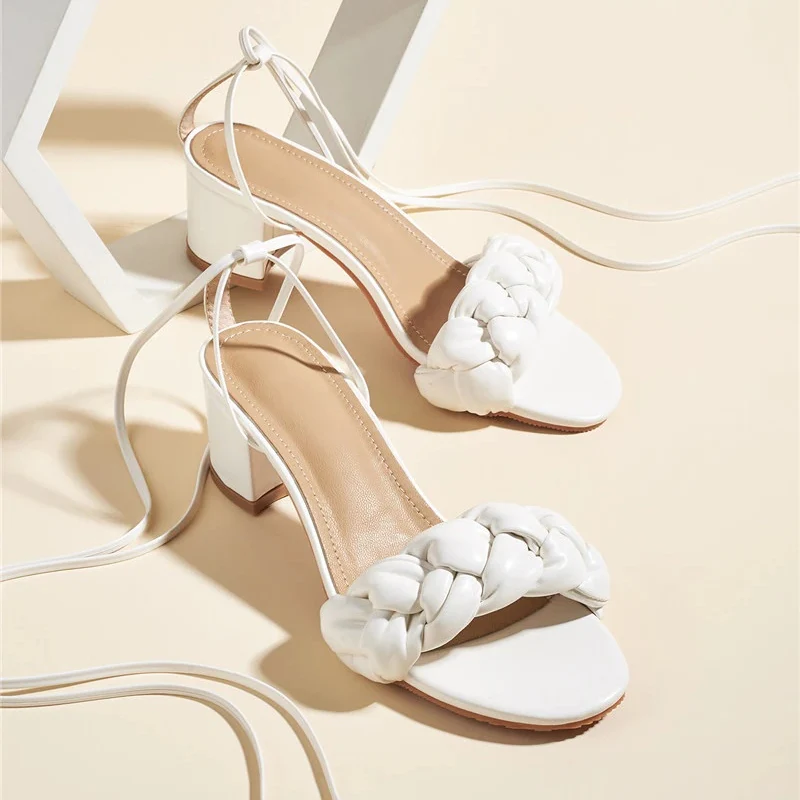 El modelo Ginger es una sandalia acolchada con cuerdas para atar. Diseño con tacón ancho de 5 centímetros
