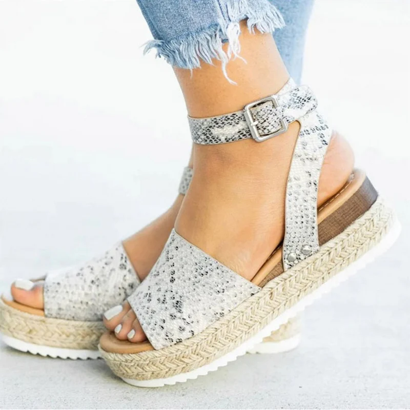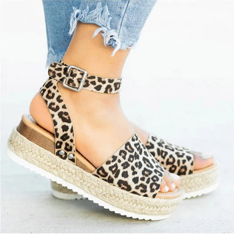 El modelo Iova es una sandalia con plataforma de esparto y refuerzo en el tacón. Diseño abierto con hebilla en el tobillo.