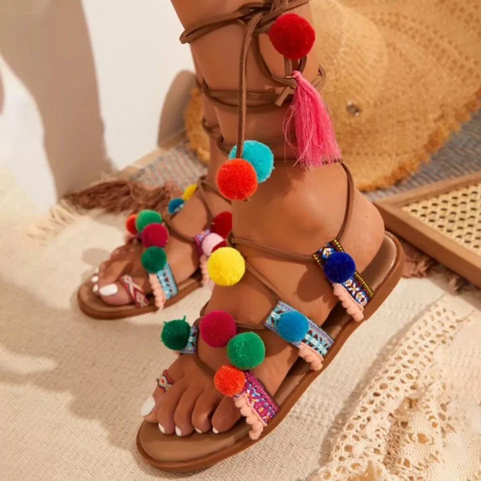 El modelo Iria es una sandalia plana con suela marrón de gel y decoración de pompones, abalorios y borlas. Este artículo es artesanal y puede tardar más días en ser enviado.
