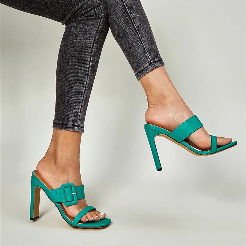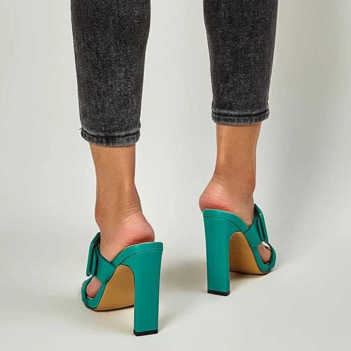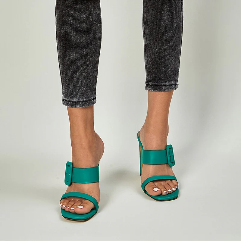 El modelo Jimena es una sandalia alta con hebilla. Diseño verde turquesa con tacón ancho de once centímetros