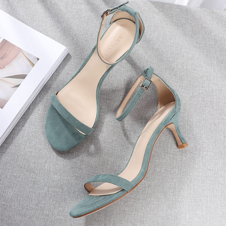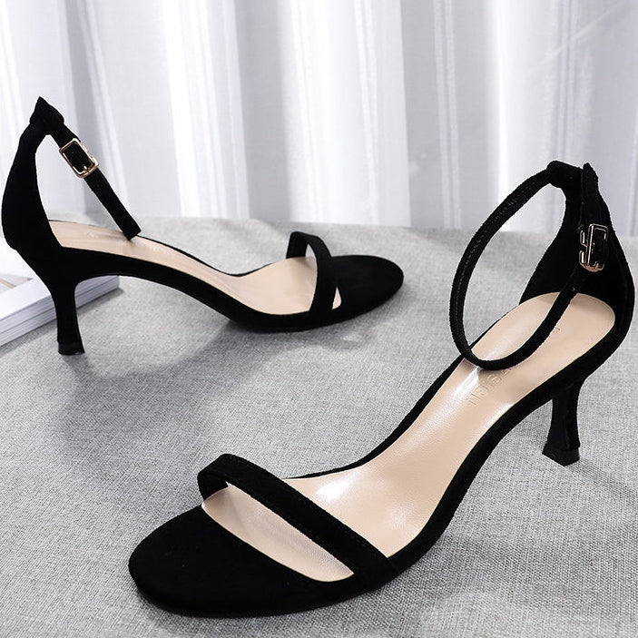 El modelo Lara es una sandalia abierta con suela de goma. Diseño con hebilla y tacón de 6 centímetros