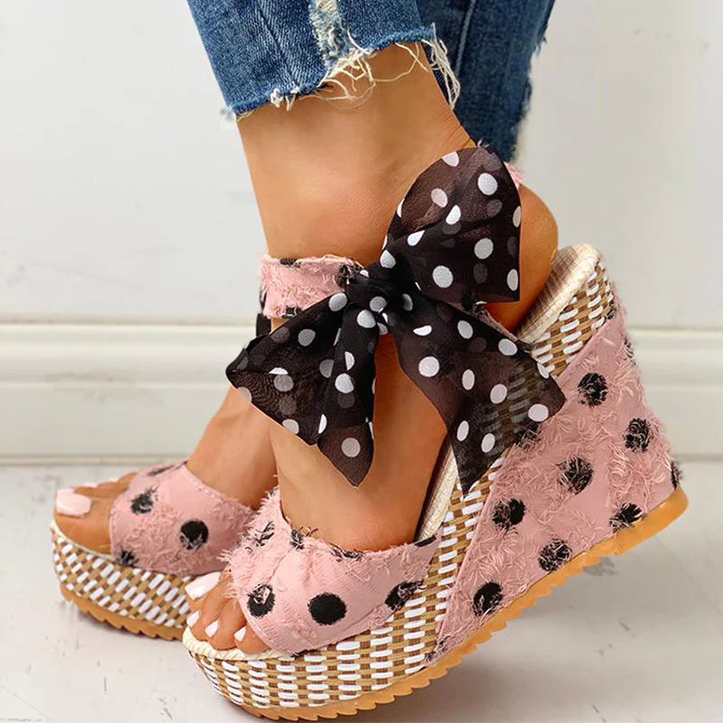 El modelo Nahia es una sandalia con suela de goma antideslizante. Diseño estampado de lunares con lazo. Plataforma de 10 centímetros