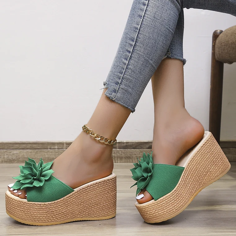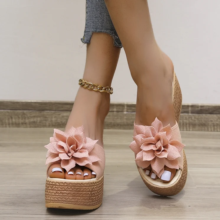 El modelo Nisia es una sandalia con plataforma de esparto. Diseño con flor delantera y altura de 10 centímetros