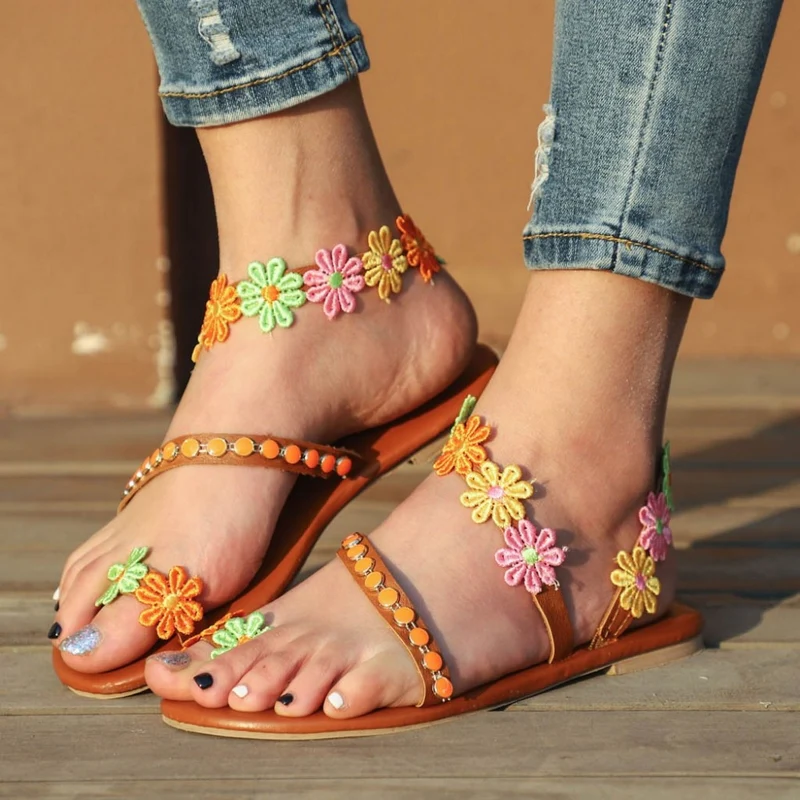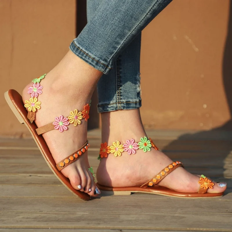 El modelo Salma es una sandalia plana con suela marrón de gel y decoración de flores de colores y broches naranjas