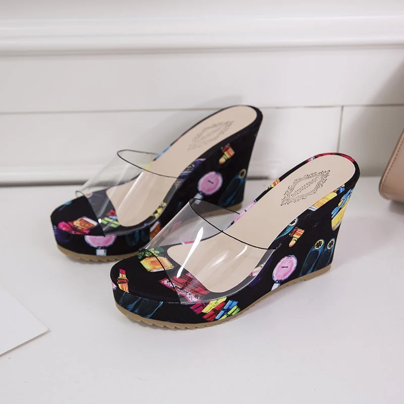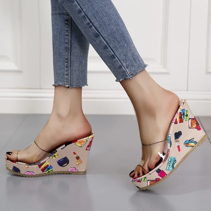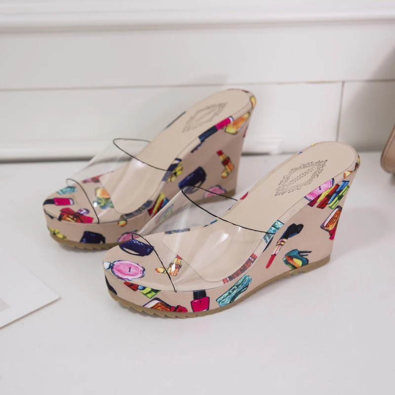 El modelo Vinna es una sandalia de plataforma. Diseño con banda transparente y estampado de dibujos. Altura de 10 centímetros