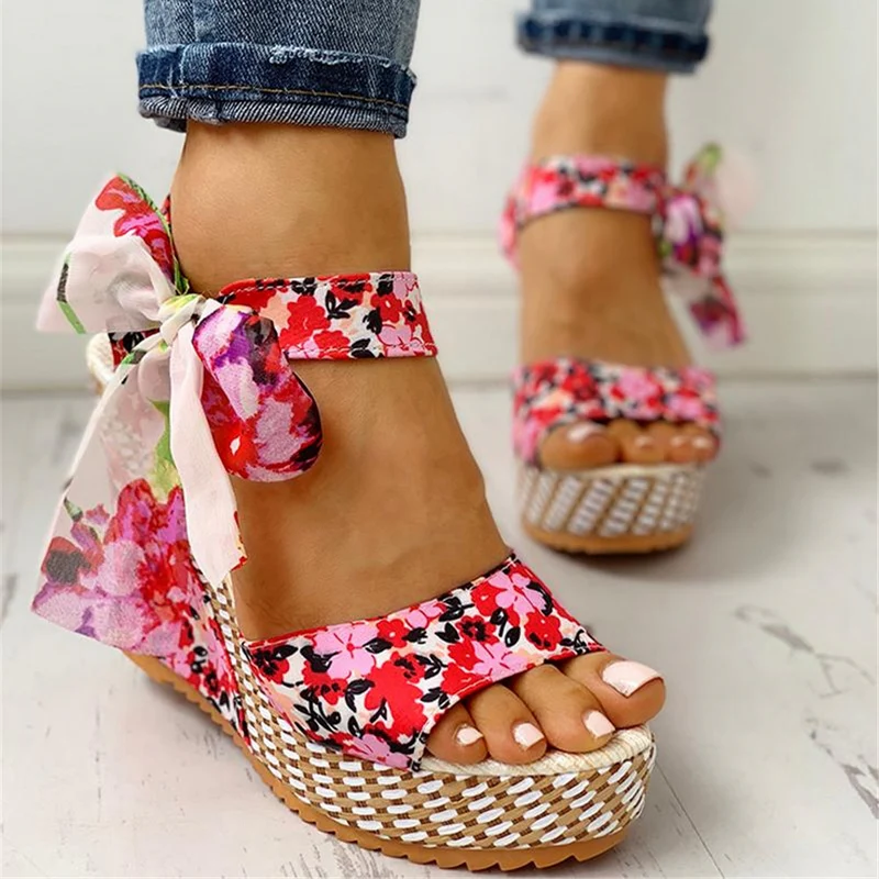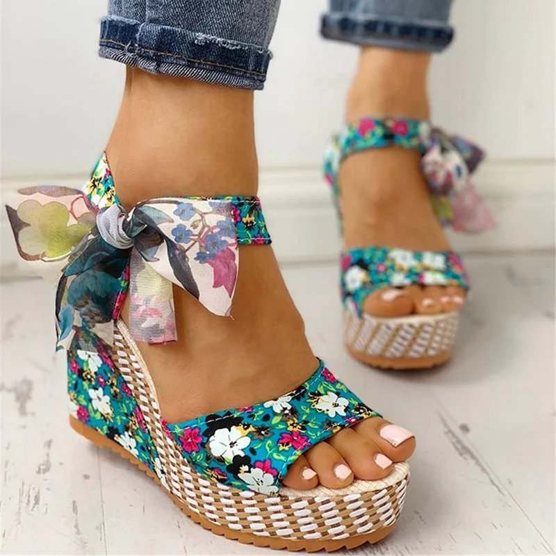 El modelo Violeta es una sandalia con cuña alta de esparto. Diseño estampado floral con lazo en el tobillo