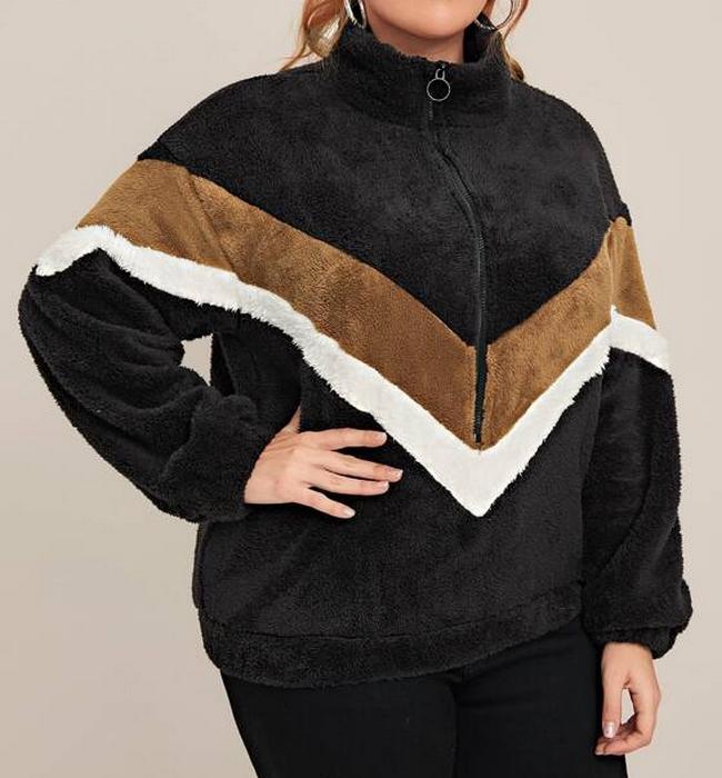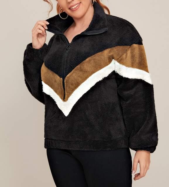 El modelo Camde es una sudadera para talla grande tipo peluche con cremallera diseñada en negro con bandas de color