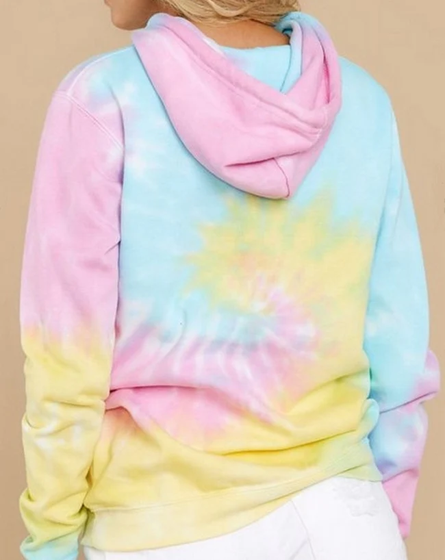 El modelo Cedye es una sudadera con capucha y bolsillo. Diseño tie-dye en tonos pastel