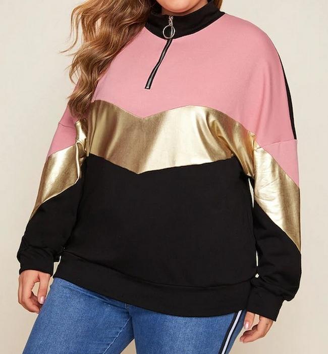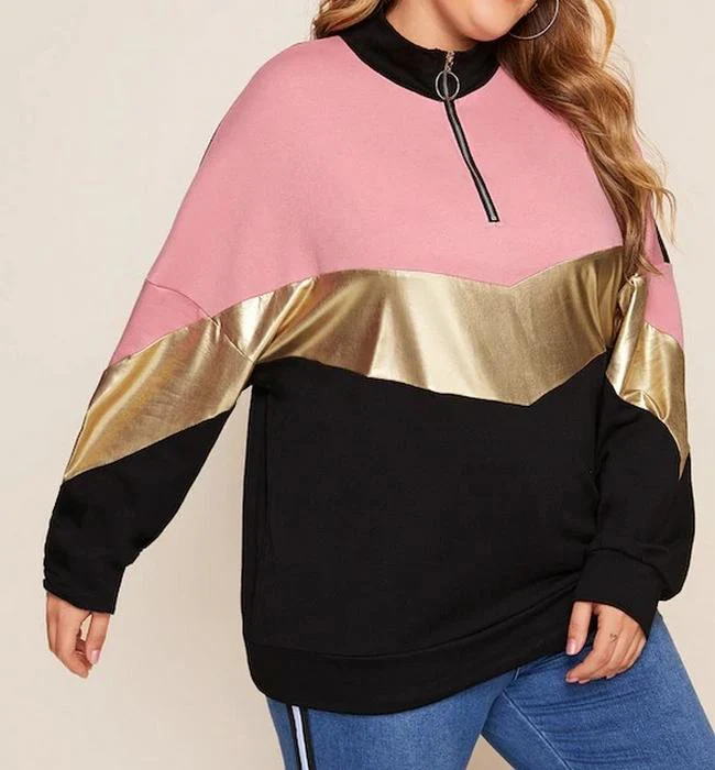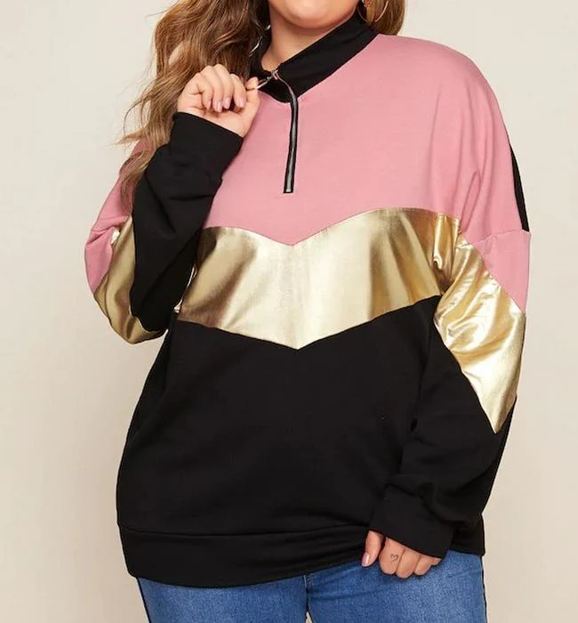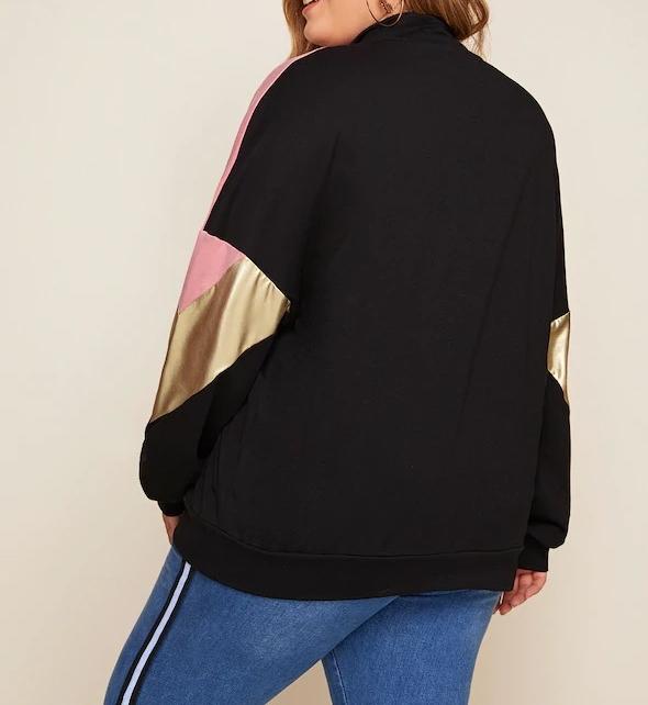 El modelo Cidia es una sudadera para talla grande con cremallera diseñada en negro y rosa con banda de color dorado