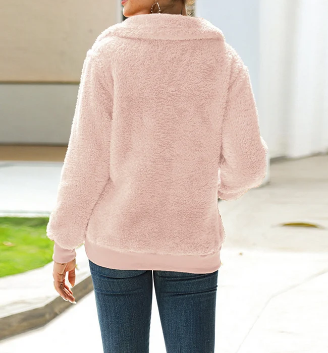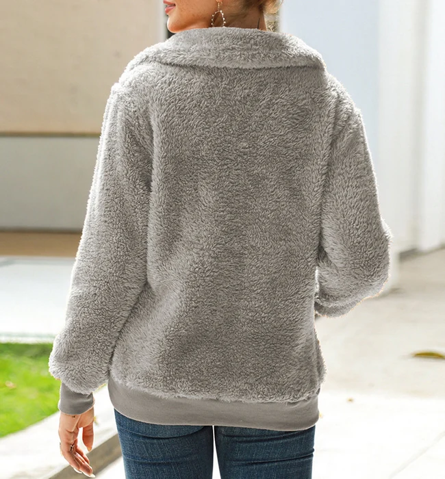 El modelo Cutie es una sudadera con cuello vuelto y bolsillo. Diseño efecto peluche con cremallera