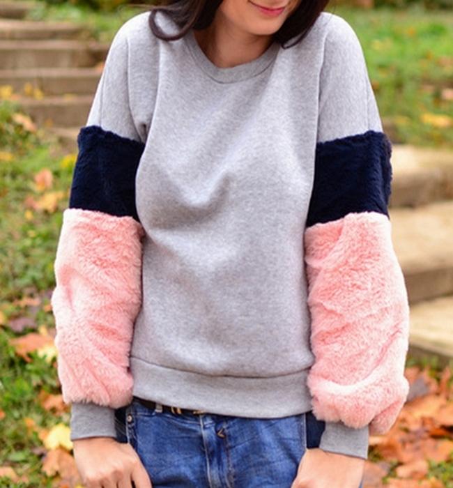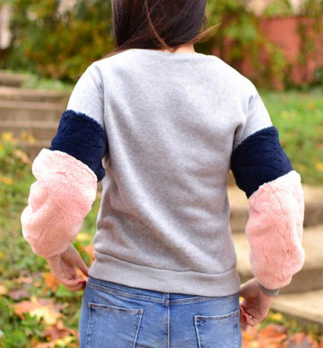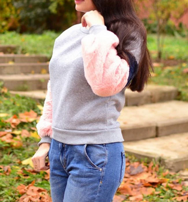 El modelo Duna es una sudadera gris con mangas rosas y azules de estilo peluche